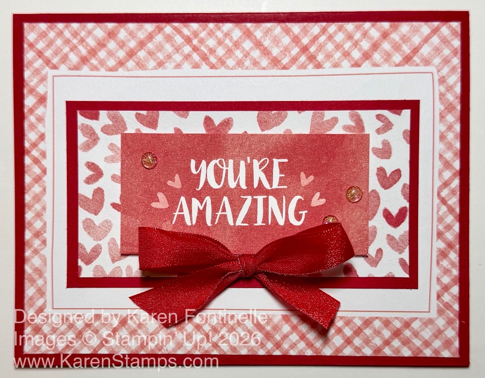 The greeting is stamped in Shy Shamrock ink from the Paradise Garden Stamp Set. It is stamped on Basic White and cut out with the banner die in the set. I trimmed off the right end of the banner to line up with the Shy Shamrock cardstock on the right since I wanted it shorter. It is popped up on Stampin’ Dimensionals. The flowers and leaves are adhered flat on the embossed layer except for a couple of flowers that are popped up along the greeting.