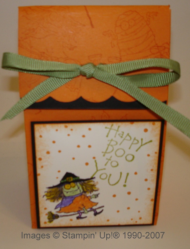 Here is a cute little box to make for any occasion, called the 2-5-7-10 box on Splitcoaststampers. Click here for the tutorial on their site. It really was easy to make. Again I used the Booglie Eyes stamp set, first to stamp tone on tone on the Pumpkin Pie cardstock to make the box, and then used the witch on the front piece of cardstock. To make the scalloped edge, I used the corner rounder punch. To make the scalloped edge show up, I decided t just stick a strip of black cardstock underneath it. Really fun to make! Try it!
