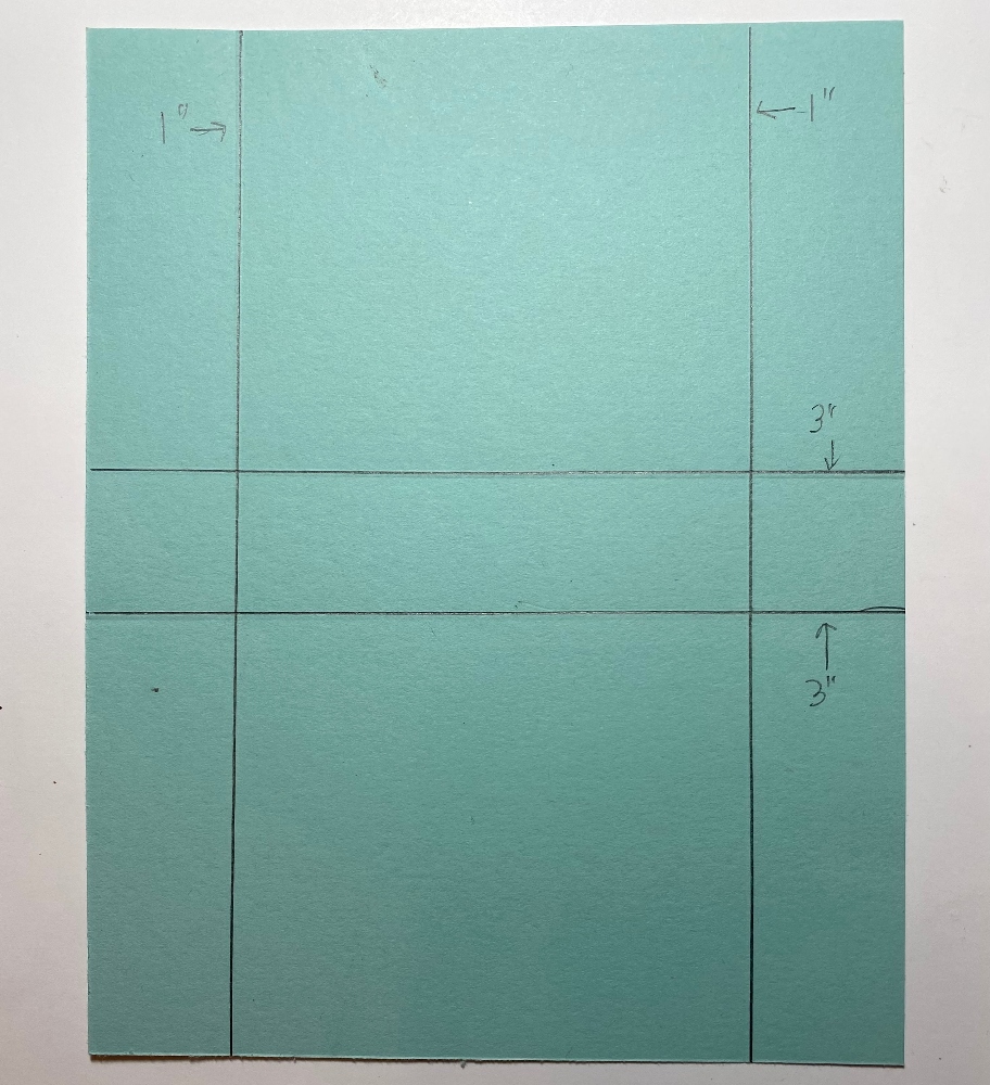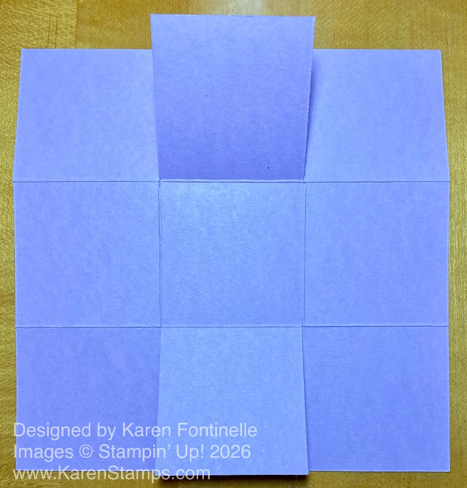 To make this little treat box, start with a piece of cardstock 5 1/2″ x 7″. Once you know how to make it, I’m sure you could modify the size. Putting the 7″ top of the paper at the top of the Paper Trimmer or Scoring Tool, score at 3″, turn and score at 3″ on the other side. Or you could say, score at 3″ and 4″, giving you a 1″ space in the center for the box that will hold the candy. Turn the paper to the 5 1/2″ side and score at 1″ on both sides in the same way. Crease and fold on all the score lines. From the top and from the bottom, cut on the 1″ score lines up to the center 3″ score lines. This will make the flaps that will form the candy box inside.