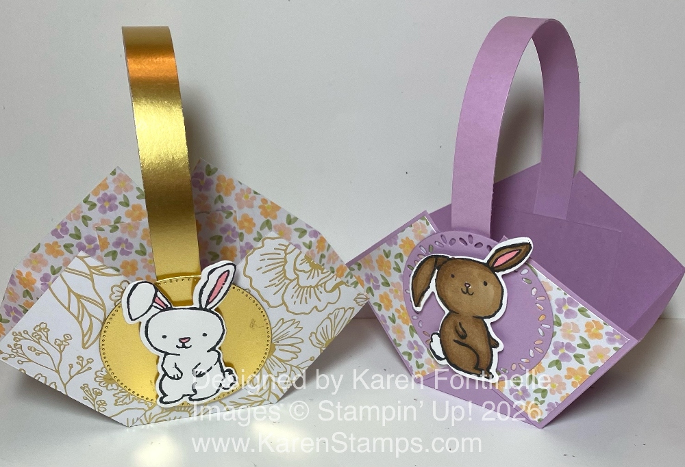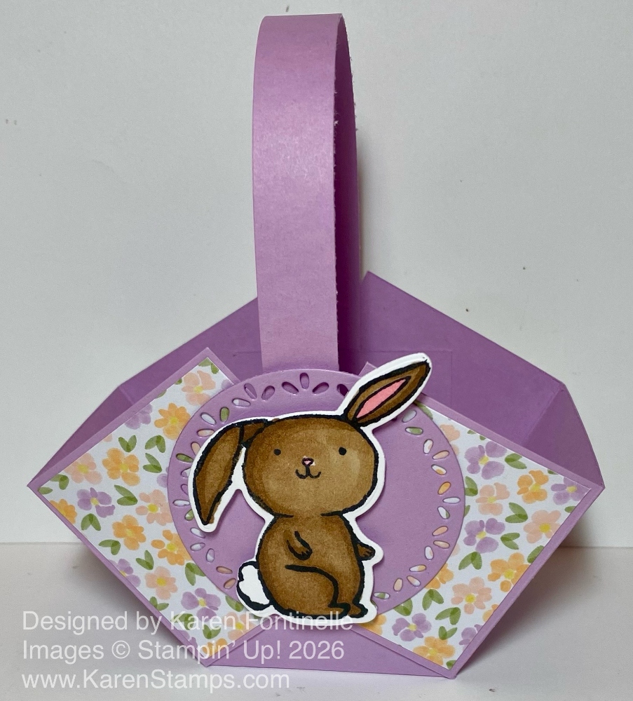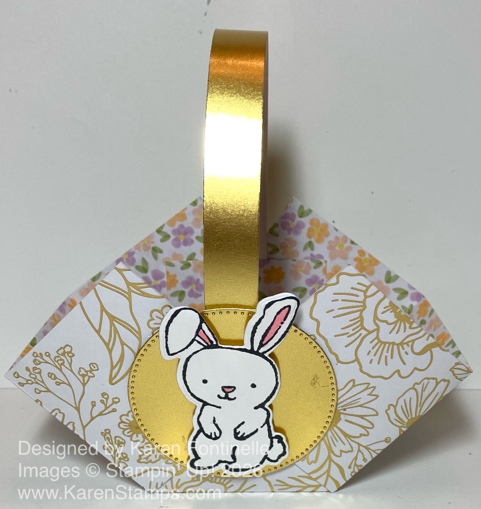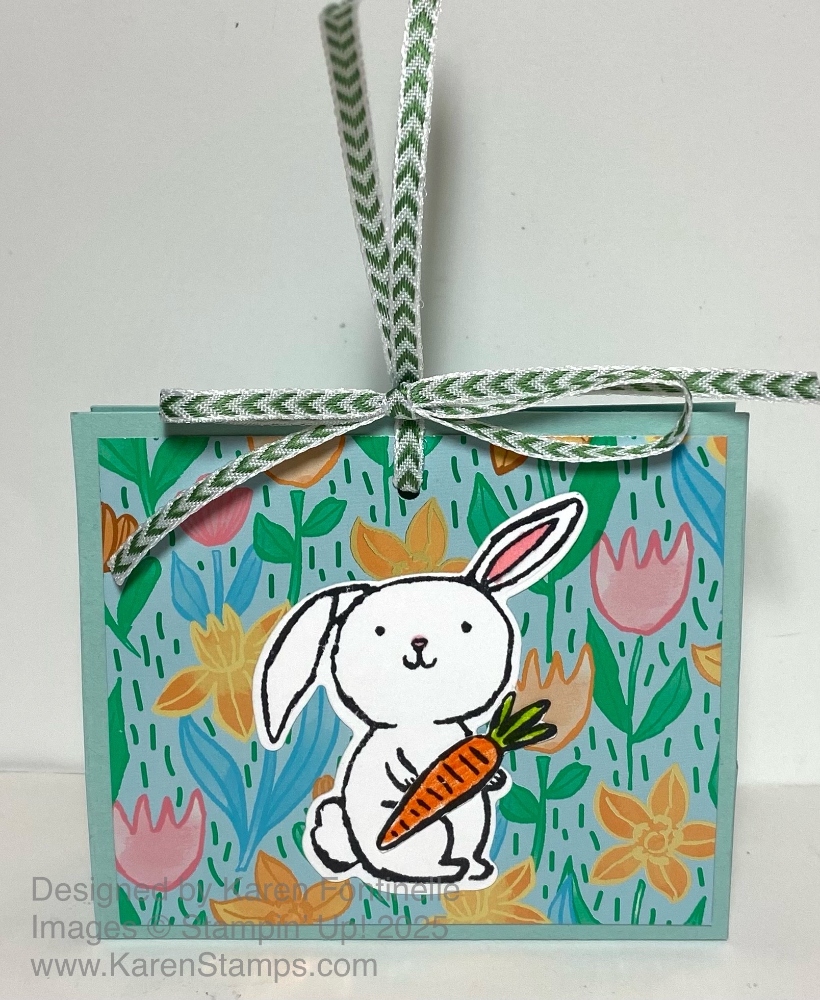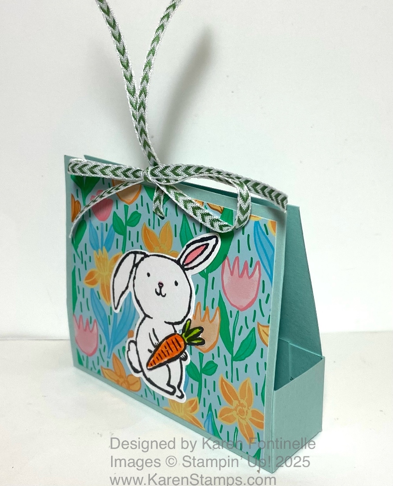 Then decorate the front at least, maybe the back, too, if you like. I added a piece of the Easter Joy DSP with tulips and daffodils. The sides are 3 1/2″ wide x 3″ tall, so I cut the DSP at 3 1/4″ x 2 3/4″. The bunny is stamped with Memento ink on Basic White using the Easter Basket Stamp Set. The carrot is also stamped and colored with Watercolor Pencils (simply because my husband was in the way of my Stampin’ Blends!). I cut it out and had the bunny hold it in his paws!