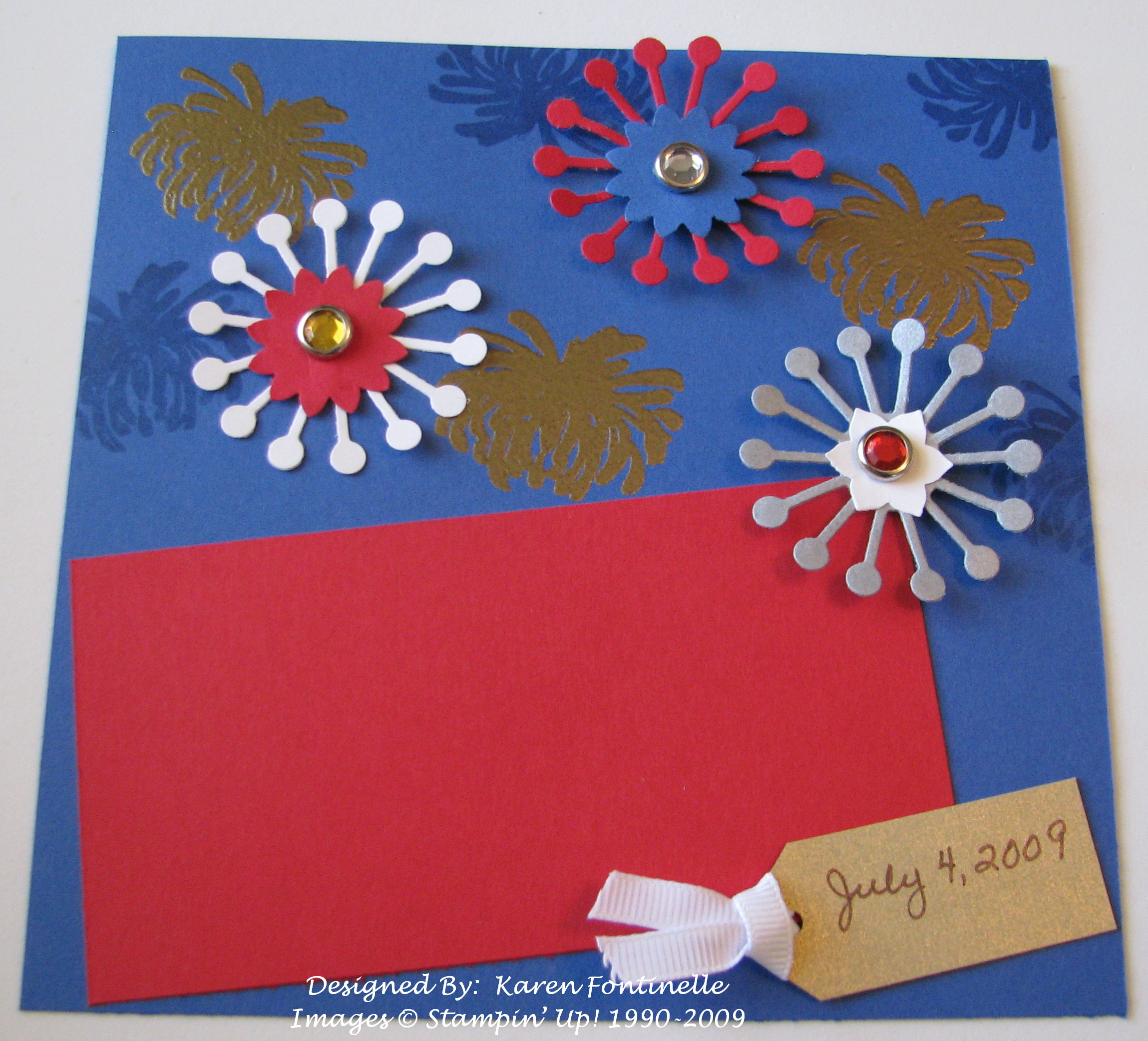 Just made this 6×6 scrapbook page….very quick and easy! You wouldn't think you could use a flower stamp to make fireworks, but I did! I stamped the top of the flower from the stamp set "Kind and Caring Thoughts", a Level 3 Hostess Set from the new Stampin' Up! Idea Book & Catalog. I just used Versamark ink for both the watermarked (bluish) fireworks and also to emboss with the gold embossing powder. That provided the background. Then I wanted to use the Sizzlit Die "Sparkle" with my Big Shot to make the 3-D fireworks! The center needed something, so I punched some of the flowers from the Boho Blossoms Punch and inserted a large rhinestone brad in each. Now if only I had taken pictures!!
