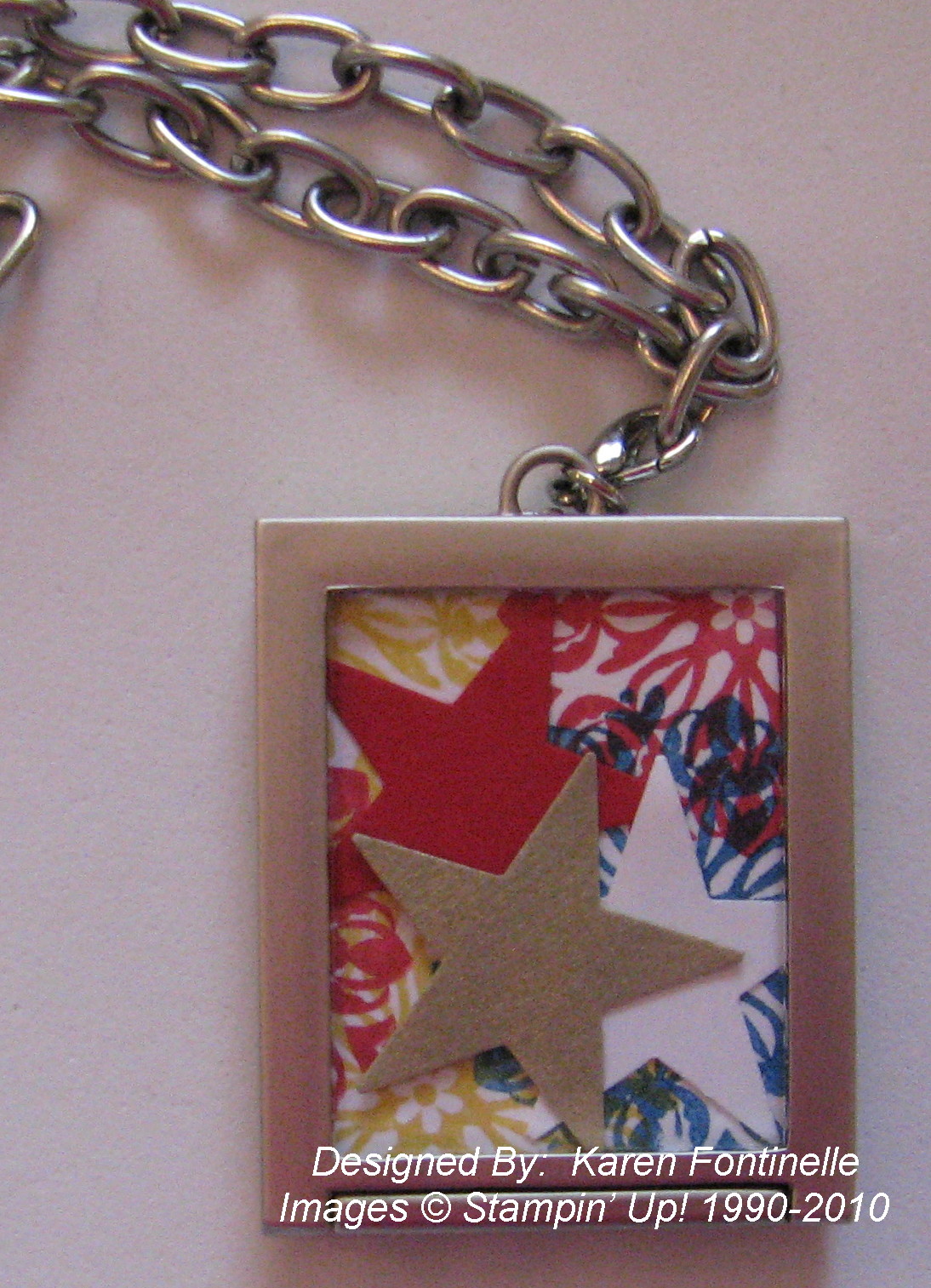 The backside of the charm I just stamped that same medallion from Charming in Real Red, Daffodil Delight and Pacific Point ink and punched out the three stars with the Star Punch (retired). I think we need a punch with itty bitty stars!