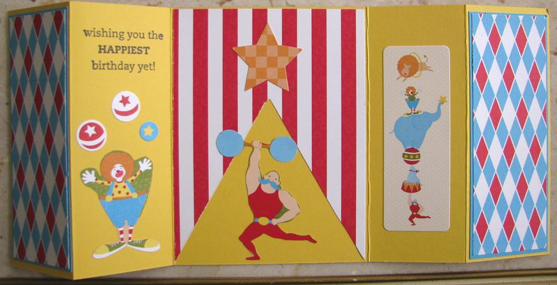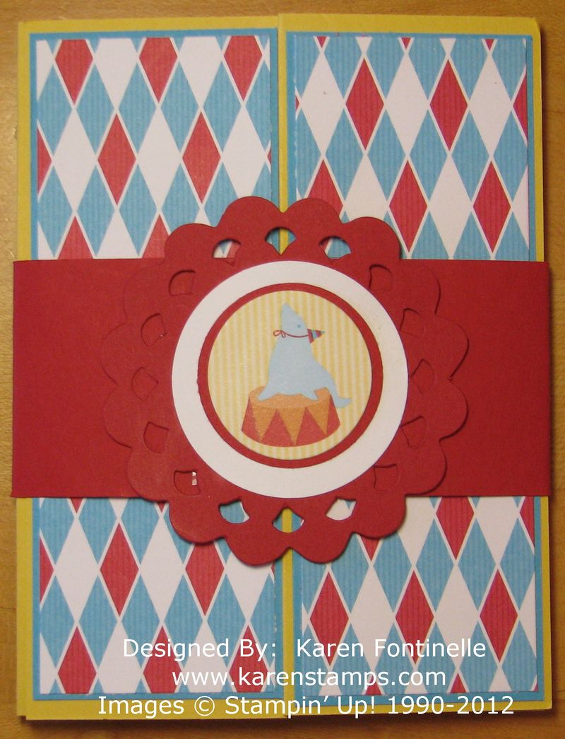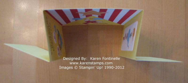 Here is the inside decorated with the Big Top Birthday Designer Series Paper #122348. Besides just using the paper, I cut out some images to place on the card. Also, another fun thing is to add die-cuts from the Big Top Birthday Quick Accents #122368.