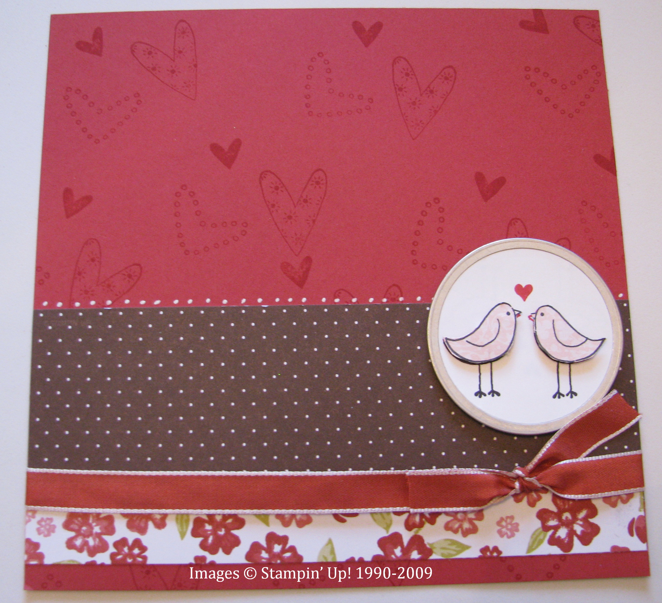 It didn’t take too much work to figure this one out, I just copied the page from the Love You Much Bundle flyer, except that I used Bella Rose Designer Paper instead of the Candy Lane (would hate to use too much of the new paper, you know!). I used a 6×6 piece of Riding Hood Red In Color cardstock and stamped the hearts from Love You Much on the background in Riding Hood Red Ink. I also could have used Versamark for the same subtle effect. Then I adhered two strips of the Bella Rose paper to the bottom third. You can do whatever size strips you like, mine were about 1 3/4 x 6 and 1×6 with the bottom one overlapping the top one about 1/4″. You wouldn’t have to overlap since the ribbon goes across the two pieces anyway. I used my white gel pen to free-hand some dots across the top of the paper border. Then it was a chance to use one of my metal-edge tags for a change. This is the largest one. (If you don’t have the metal-edge tags, you can get the same effect with gray or silver cardstock for the bottom layer and your stamped layer on top). I stamped on a scrap piece of Whisper White paper rather than the tag itself, just in case of a mistake! The new large circle punch….1 3/4″…. fits that tag perfectly. In order to get that little red heart above the birds, I kind of stamped the top part of the stamp with Riding Hood Red and the rest in black, punched that out with the big circle punch and adhered it to the tag, right over the white part that is already there! Then I stamped the birds again with Stazon black….now either you can do this on Whisper White and color in your birds whatever color you wish, stamp them on colored cardstock, or stamp them on Designer Paper….then cut out carefully (without the legs!) and adhere them to the tag, right over the stamped birds with Dimensionals. I also used Dimensionals to adhere the tag to the scrapbook page.