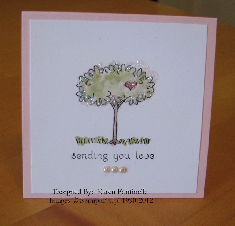 Steven is home this weekend with several friends to participate in a wushu competition today and Carolina thought she'd like to try some stamping. After all she was staying in my craft room, which can be a scary proposition with all that is in there! So we sat down at the kitchen table and made this card so she could try out some stamps and ink and add some embellishments with the seam binding, a punched out flower with the Blossom Punch #125603 and even a little rhinestone! We had a great time!