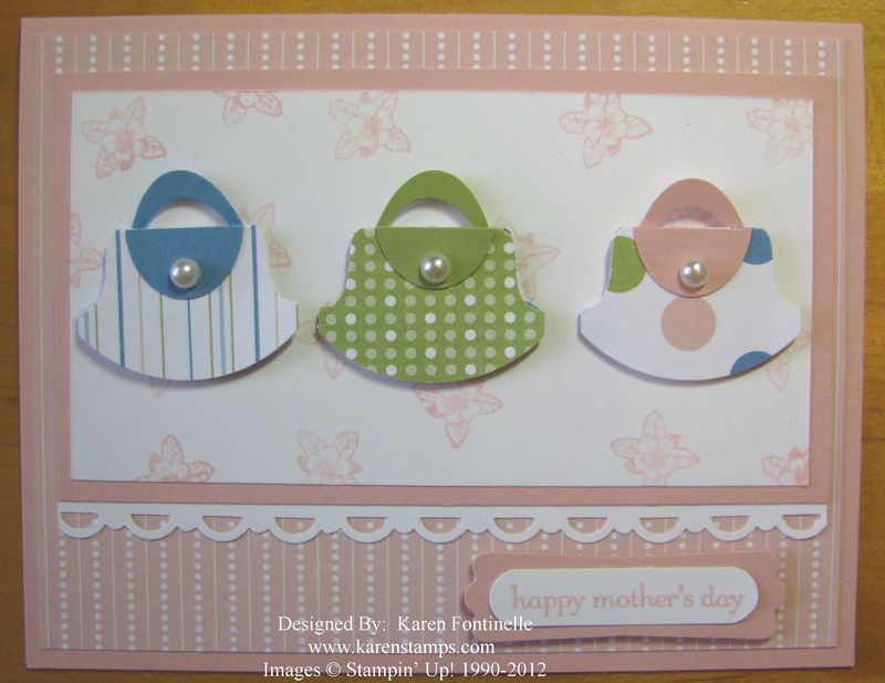 Mother's Day is coming up on Sunday, May 13th, so here is an idea for a Mother's Day card for you. One time in a stamp camp my stampers made a similar card using the Round Tab punch #119864 (it's retiring!) to make these purses, and I think it is one of the most memorable cards. Everybody liked it and people still remember making that cute card! Just think of the interchangeable purses and designs you can make with this Round Tab Punch! (if you get it before it retires!)