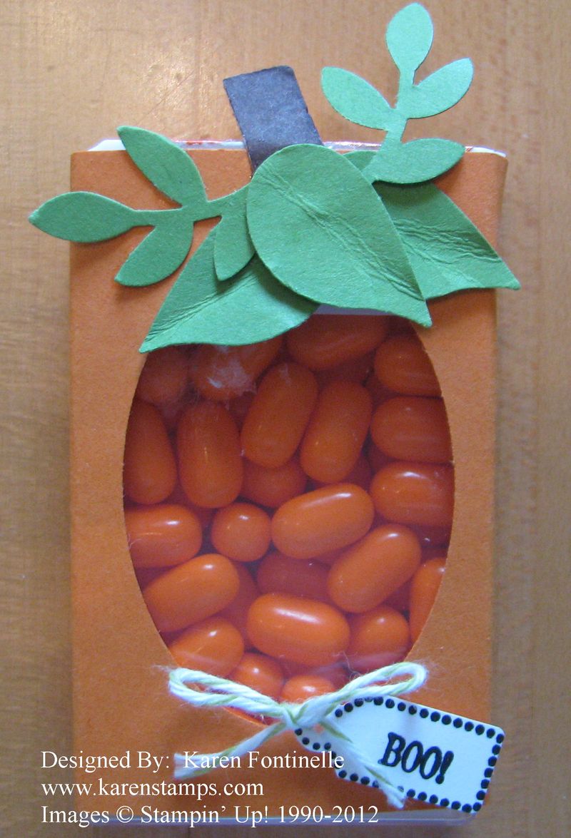 Then to make my box look like a pumpkin, I punched some leaves and branches with the Bird Builder Punch #117191 and cut a little scrap of brown for the pumpkin stem. You could also add scraps of black to make a jack-o-lantern face if you wanted to. You could also add a piece of window sheet inside the card stock and glue a face on that…or just stick on the Tic Tac box. Then for some embellishment, I added a "Boo" from the Tiny Tags stamp set and punched out with the Jewelry Tag punch #117190. Finally, I tied on a little piece of Lucky Limeade Baker's Twine to the little tag.
