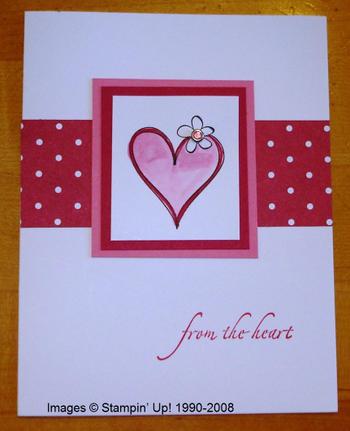 Since I hadn’t yet received my new order with the Valentine Bundle, I decided to try to make a valentine with another set. I chose Time Well Spent, a Level 3 Hostess set in the Spring~Summer Collection 2008, plus Holidays and Wishes for the words. After running through many ideas in my head and nothing seeming quite right, I decided on "simple". I used Black Stazon Ink to stamp the heart and watercolored with the Watercolor Wonder Crayons and Aquapainter. That’s pretty much my favorite way to color in these days….except for maybe the Stampin’ Write Markers, which I use quite often. I added a little strip of Cutie Pie Designer Series Paper under the layers of Regal Rose and Rose Red cardstock. And for an extra-special touch for the heart I added a pink Fire Rhinestone Circle Brad.
