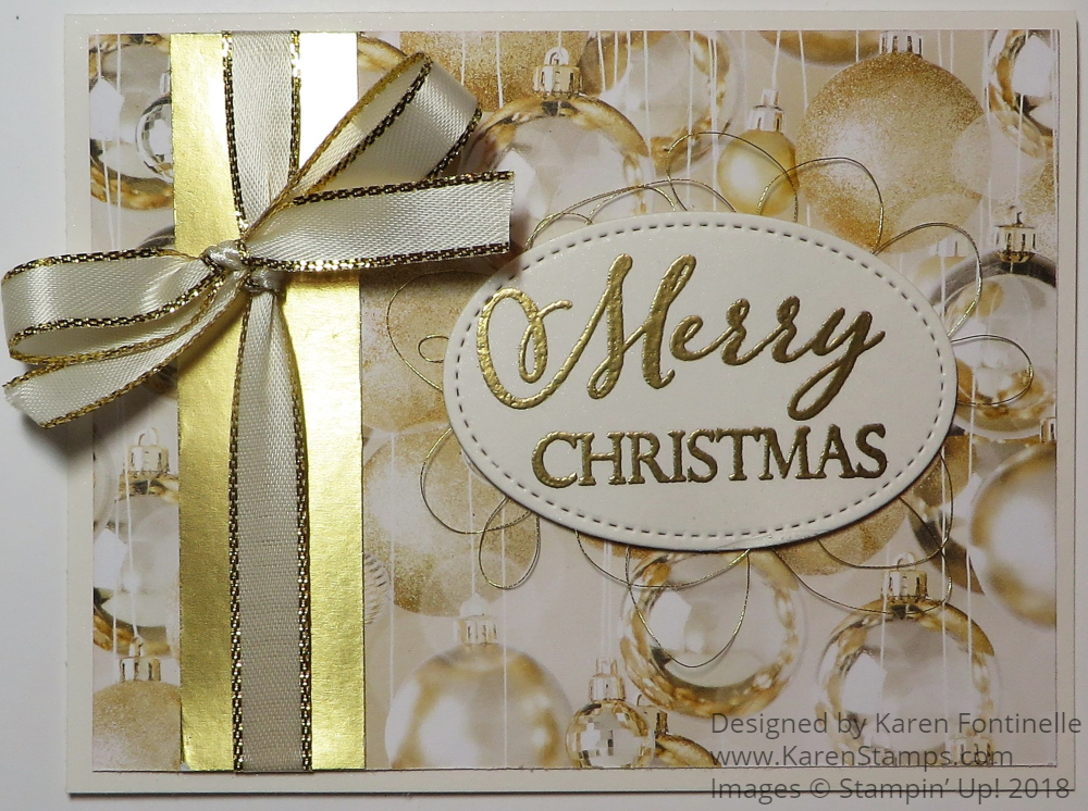 The card base is Shimmery White Cardstock with a layer of the Ornament pattern in the All Is Bright Designer Series Paper. I chose the Shimmery White Cardstock because it is not SO white, which I thought went better with the designer paper and the ribbon. I originally planned to have a layer of Gold Foil but I only had scraps left! Time to order more! However, that made for a slightly simpler card and I was able to use a scrap for just the right touch as an accent on the side. The Gold 3/8″ Metallic Edge-Ribbon is so pretty to use for a festive card.