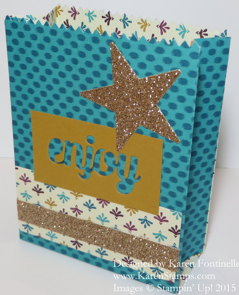 The negative image of the word “Enjoy” is leftover from something else I made with the word cut out that I just happened to save and it came in handy for this bag! I had a scrap piece of the same Bohemian Designer Series Paper so I just turned it over and glued it to the front of the bag with a scrap strip of Gold Glimmer Paper across the front. I also used the star die in the package to cut out the star out of the Gold Glimmer Paper. So easy!