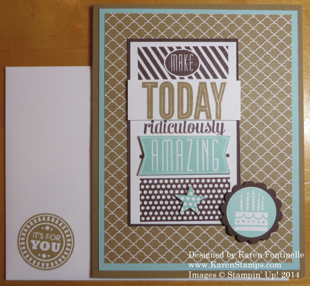 I’m not bragging, this is the Amazing Birthday card! It’s made with the Amazing Birthday Stamp set by Stampin’ Up! and it is going to my husband. This stamp set is so versatile, you can make it for anyone, you can use the stamps to decorate birthday party favors and make decorations like cupcake toppers. I happened to choose Soft Suede and Pool Party, along with Whisper White, with a touch of Chocolate Chip thrown in. The background paper is from the In Color stack. Stamp the large greeting stamp a couple of times, cut out some of the words and then mount them with Stampin’ Dimensionals to make them pop on the card over the same greeting. The little star I just punched to put a little something in that space. Notice I even stamped the corner of the envelope!
