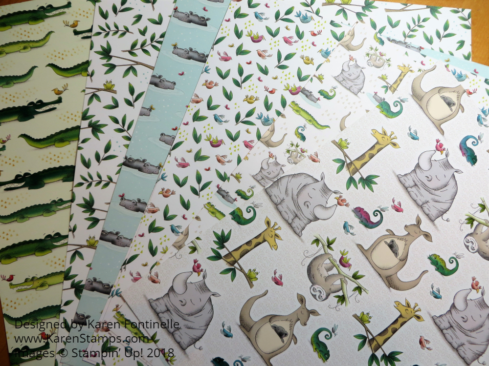 This could be a baby card for a girl or boy, and the paper can be used for adults and older children as well – anyone! There is also a coordinating Bundle with stamp set and dies, the Animal Outing Bundle, that adds even more to your cardmaking and scrapbooking.