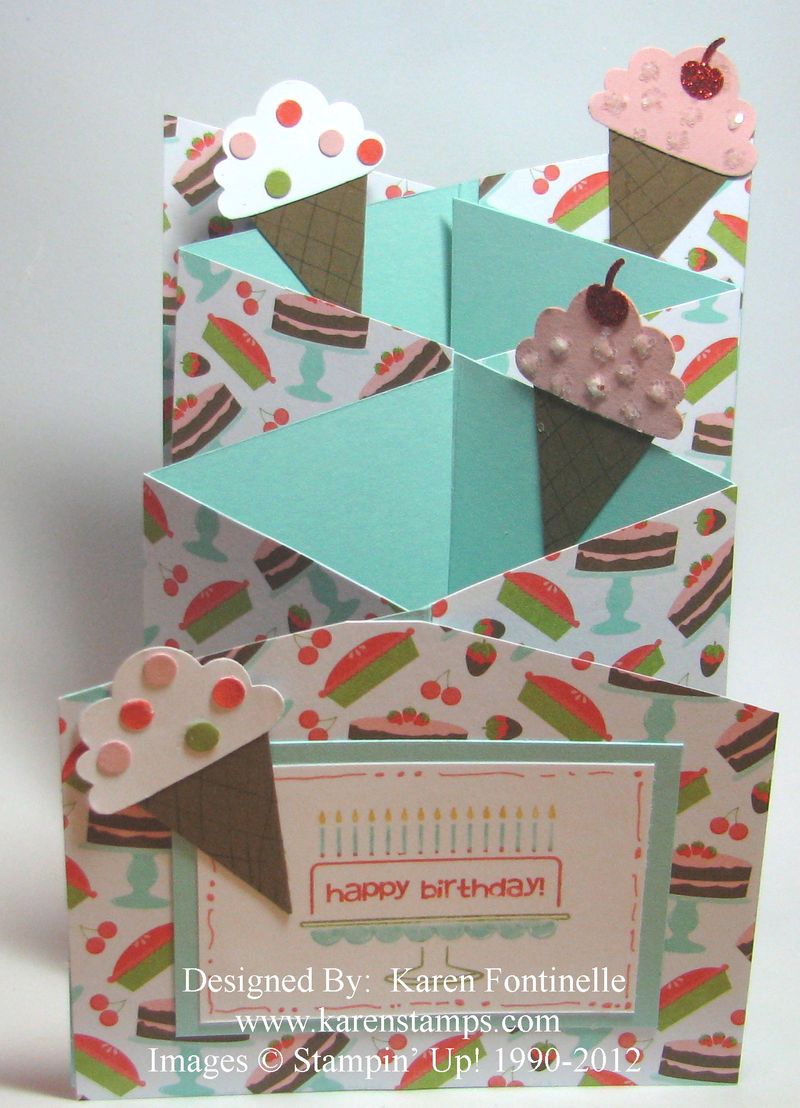 And here's another cascade birthday card like yesterday, this time with cake and ice cream! The cascade design is made the same way….I used Pool Party card stock as the base and added the Sweet Shop Specialty Designer Series Paper (if you have some in your stash!)