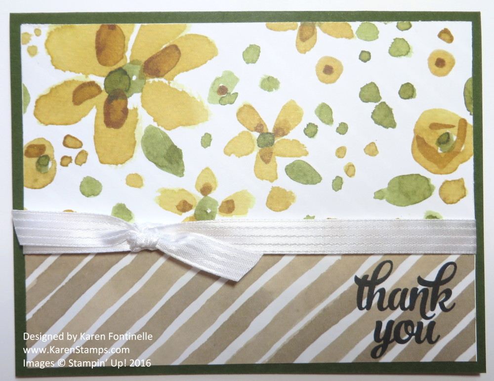 So here is a card made with the beautiful English Garden Designer Series Paper with some pretty flowers! This style card is so easy to make, one you want to keep in your creative mind as a go-to layout. The card base is Mossy Meadow Cardstock, but it could be any neutral color. I did use a layer of Whisper White Cardstock underneath the designer paper because I wanted to tie a ribbon around this front layer. The two patterns you see are the opposite sides of the same paper. I thought they looked great together on the same card. The ribbon tied around is the Whisper White 3/8″ Stitched Ribbon. The greeting is a stamp from the Tin of Cards Photopolymer Stamp Set. Even if you don’t have the Tin of Cards Project Kit (very cute, by the way!), this is a great stamp set to have on hand. I was keeping it simple so I just stamped directly on the designer paper. (Better to do before you have the card finished and everything glued down, but I got lucky and didn’t mess it up!)