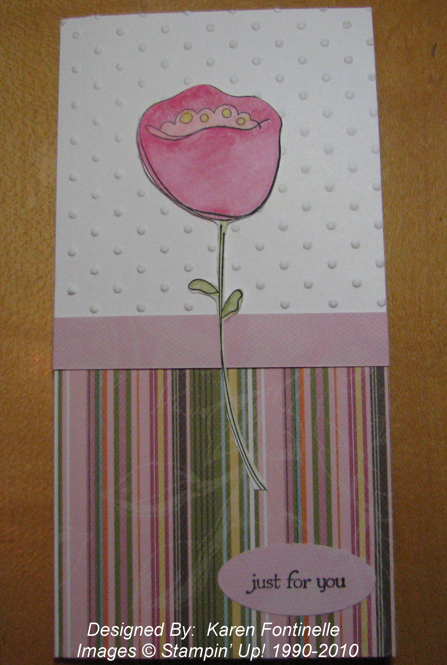 I thought I would use some of the Sweet Pea Designer Paper #117161 in the Occasions Mini, so then pulled out some Pretty in Pink card stock to coordinate. But I also found a scrap of Whisper White, already embossed with the Stampin' Up! Perfect Polka Dots Textured Impressions Folder #117335. Both scraps were rather narrow so I decided to make a 6"x3" card. I stamped the flower from "Awash with Flowers", colored in with Watercolor Crayons, and cut out with my Paper Snips scissors #103579. I added a little sentiment from Teeny Tiny Wishes #115370. I considered some other embellishments, but had to stop myself! The card looked fine being simple. Sometimes you have to know when to stop!