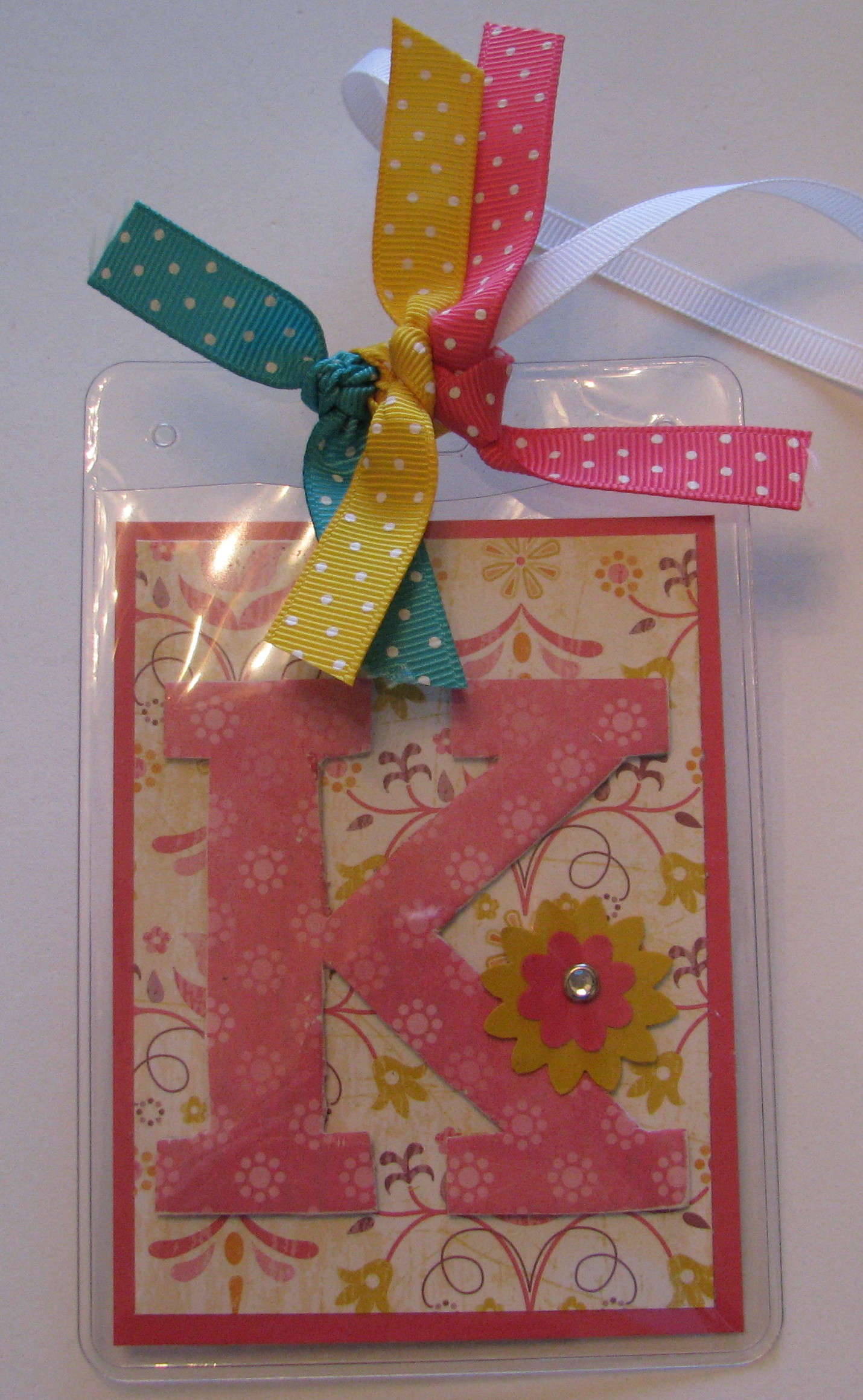 Here’s sort of a sneak peek! This is a tag I made to put on whatever bag Stampin’ Up! gives us at Convention! With thousands of the same bag, it’s nice to have something different on yours to identify it. I was going to use some other DSP, but could not resist using the bright and colorful Razzleberry Lemonade Designer Series Paper…and a chipboard letter from Onboard Timeless Type. It’s so easy to cover the chipboard letter using our Stampin’ Up! Glue Stick. Just place the paper over the chipboard and then trim away with your scissors. On the back of my tag I put the Convention logo and my contact information in case the bag gets lost….heaven forbid! The plastic holder is called a Badge Holder and you can buy them in a package at an office supply store.