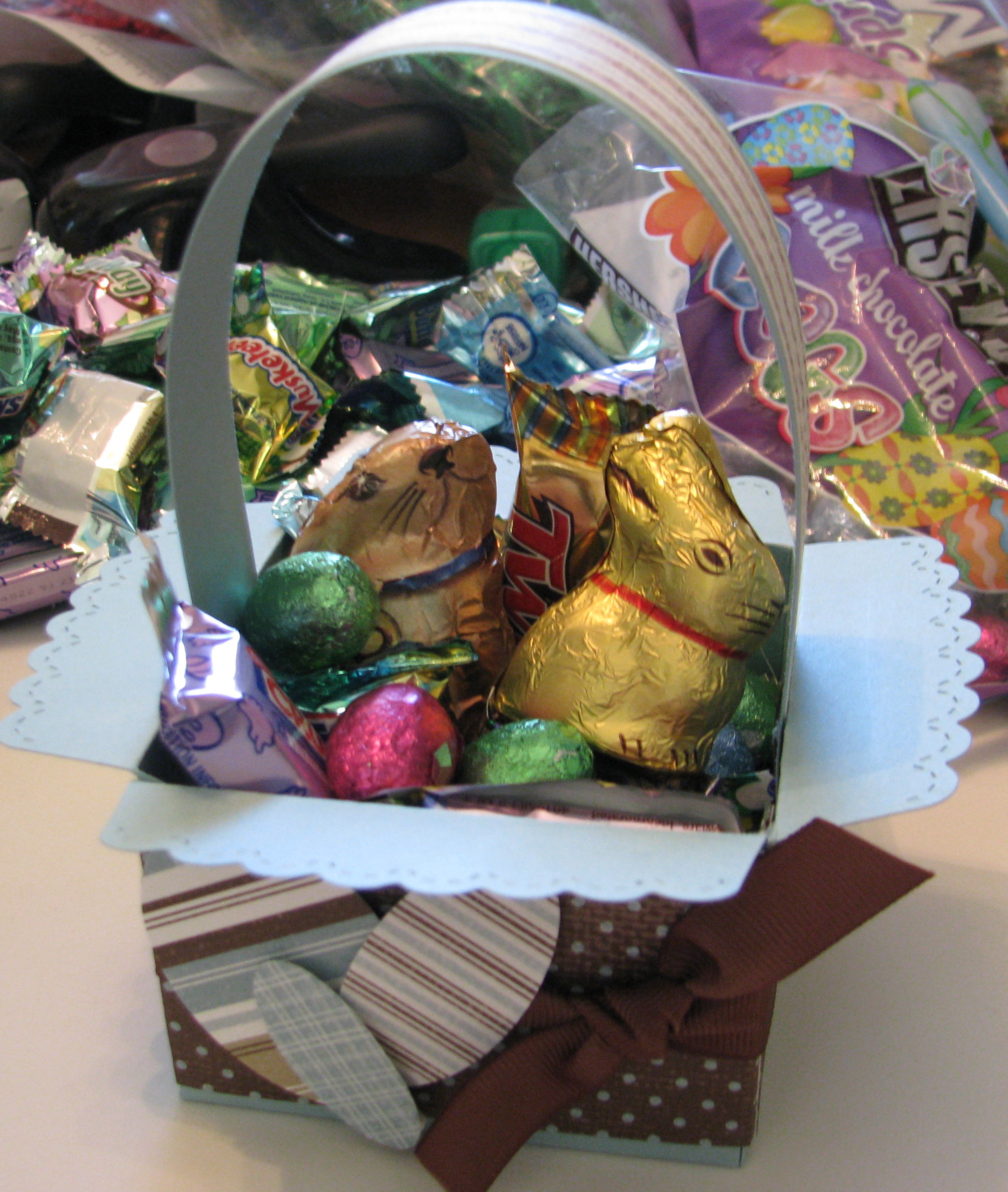 Looking for some small Easter treats to give as gifts or to mail? If you have the Big Shot, you have so many possibilities! And it doesn't take long to make something very cute! In this project, I used the Scallop Envelope die and glued four of the envelopes together into a basket. You can either leave it plain like that, or for a little extra strength or design, wrap some designer paper around your basket. In this project, I used the beautiful new Parisian Breeze Specialty DSP which already has some extra weight to the paper. Just put the bottom together by alternating the flaps (like you might on a box) and make yourself a handle. I secured the handle with the new "Flower Assortment" brads on each side of the basket. I used the oval punches to make the Easter eggs on the front.