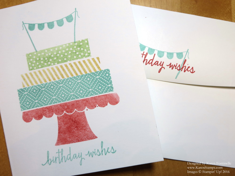I made a card similar to the ones she showed, as you can see in the photo above. I also loved the idea of how she stamped the back flap of the envelope! Remember, we should not be sending out “naked envelopes”! Stamp something on them!