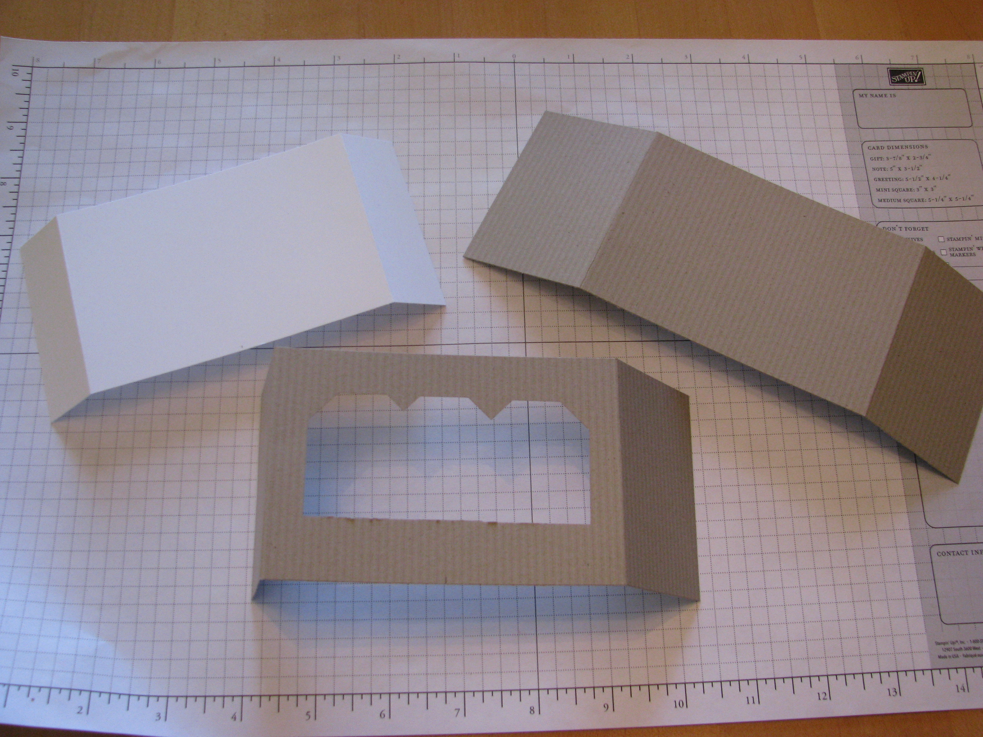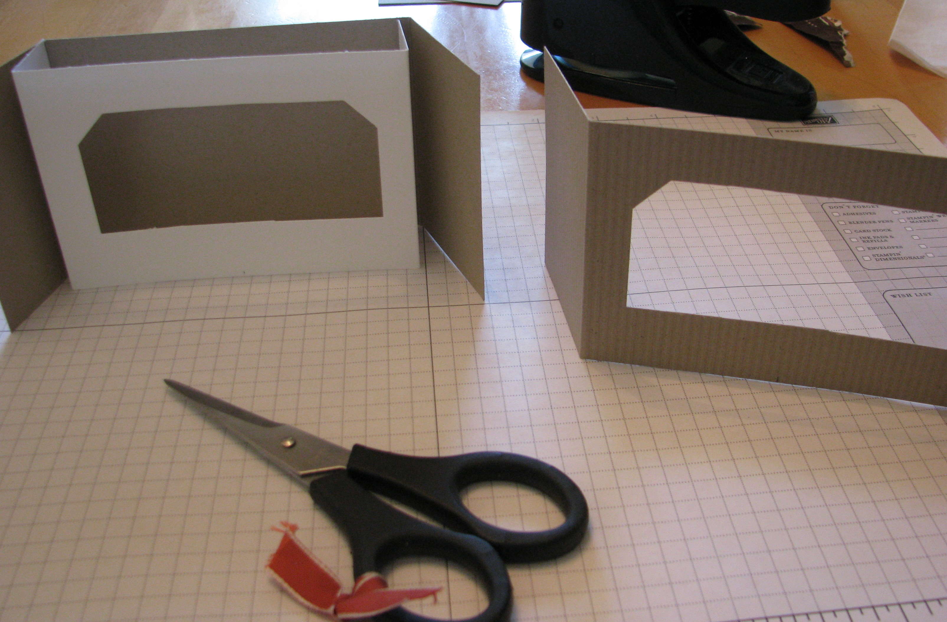Punch or cut center opening on front and middle pieces. I used the Large Tag Punch and cut off the little remaining triangles with my Paper Snips. You could use circle punches, a square punch, or even a hobby knife. Using the tag punch, I punched in the center, then off to each side, creating the large opening. You could leave space in between and make window panes. (I love to use the Stampin' Up! grid paper because on it I can measure, align, scribble, stamp, write, etc.)