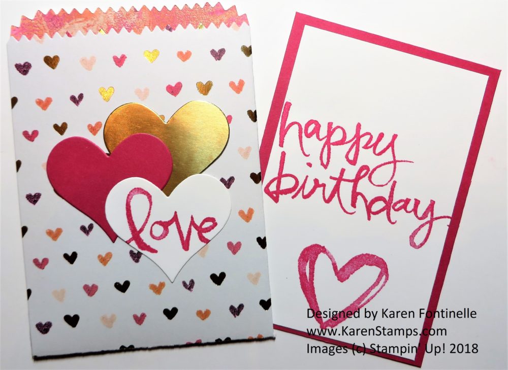The card with the cakes doesn’t need much else since the paper pattern is so bold! It makes you hungry just to look at that paper with all the beautifully decorated cakes! Just adhere a layer of the designer paper to the Pacific Point card base with a Real Red layer in between to help the paper stand out. The greeting is stamped in Real Red with a greeting in the stamp set and die cut with the Stitched Shapes Framelits Dies and layered on a scalloped oval in the Layering Ovals Framelits Dies. This is popped up on Stampin’ Dimensionals with a bit of Gold Metallic Thread would around behind the greeting in a little “nest”.