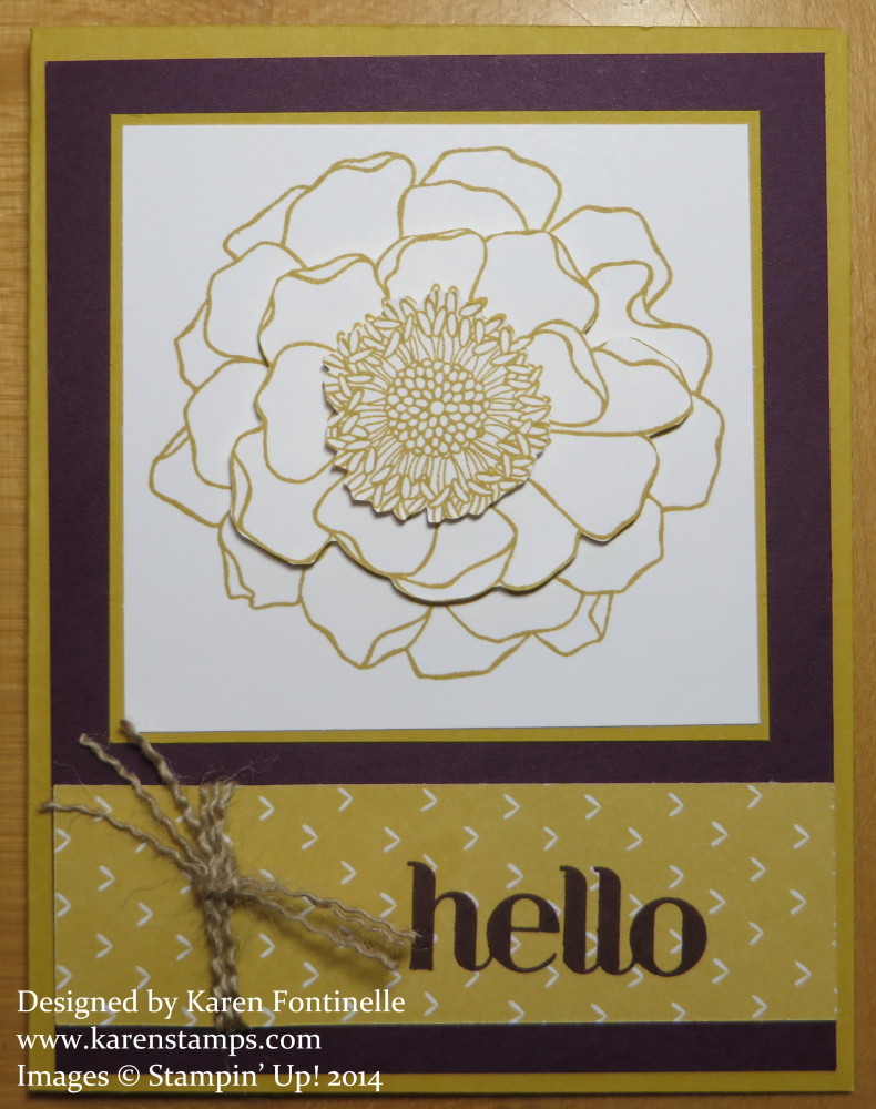 The Blended Bloom single stamp is a new one in the new Stampin’ Up! Catalog and has mostly been used to color in with the new upcoming Blendabilities alcohol markers (hopefully they will be available around the end of June or early July). But I thought I would just stamp the flower in one color and not color it in at all. And as usually happens, I changed it up a little more, stamping two more blooms and cutting out a couple of layers to make the flower more dimensional. I added a strip of the Lullaby Designer Series Paper. Don’t be fooled by the “Lullaby” paper, because there is not one image on it that will make you think it is “baby paper”. I was going to tie a piece of white Organza ribbon around the designer paper, but then I changed my mind and pulled off three threads from the Burlap Ribbon and tied that around the strip of designer paper. The greeting is stamped in Blackberry Bliss ink with a stamp from the Four You stamp set. The card stock I used is Blackberry Bliss and Hello Honey, two of the new 2014-16 In Colors.
