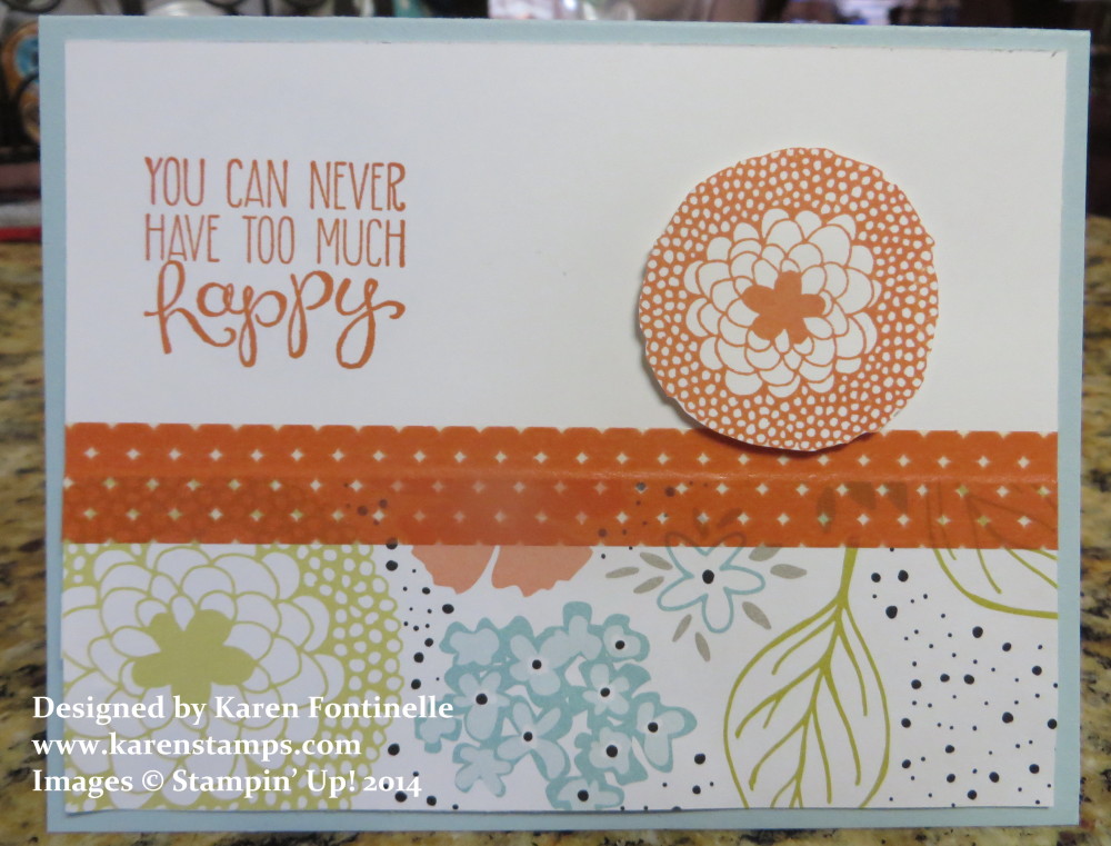 Here’s a Sale-A-Bration sneak peek preview for you! Sale-A-Bration is the biggest promotion of Stampin’ Up! With every $50 you spend, you earn a free product from the Sale-A-Bration brochure! The designer series paper you see on this card, Sweet Sorbet #133521, is one of your choices. Although it is valued at $10.95, you would get it FREE with a $50 purchase. The flower stamp is also one of your choices, the Petal Parade stamp set. I stamped it, cut it out, and popped it up with a couple Stampin’ Dimensionals. The greeting on the card is from a great set, Yippee-Skippee. The washi tape across the paper is from the Occasions Catalog, Retro Fresh This and That Designer Washi Tape. I actually got the “coordinating colors” mixed up as the paper matches Crisp Canteloupe and the tape and ink are Tangerine Tango. But it all still looks good together! And I love the saying on that stamp!!