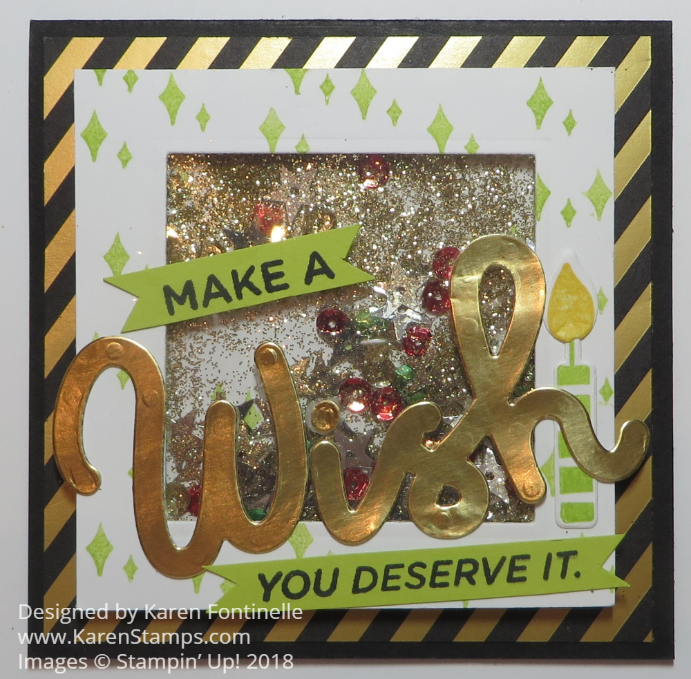 Next comes decorating the front of the card on the shaker window. I die cut the word “Wish” with the Broadway Lights Framelits Dies out of Gold Foil. I stamped the greeting with words in the Broadway Birthday Stamp Set and just hand cut the little banners. There is also a little candle and flame that I stamped and die cut.
