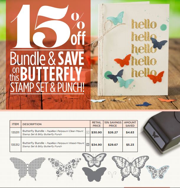 This special offer ends Monday, September 30, 2013 so be sure to get your order in by Monday or before if you are interested. You get the Papillion Potpourri stamp set plus the Bitty Butterfly Punch for a savings of 15% in the special Butterfly Bundle.