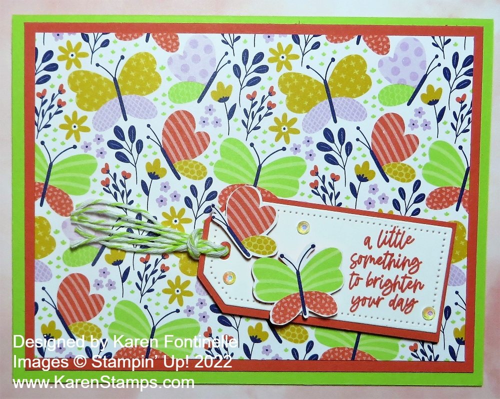 This was a pretty quick and easy design using the new Butterfly Kisses Designer Series Paper. It will certainly be fun to use so take a look at it online or on page 37 in the new Stampin’ Up! Annual Catalog.