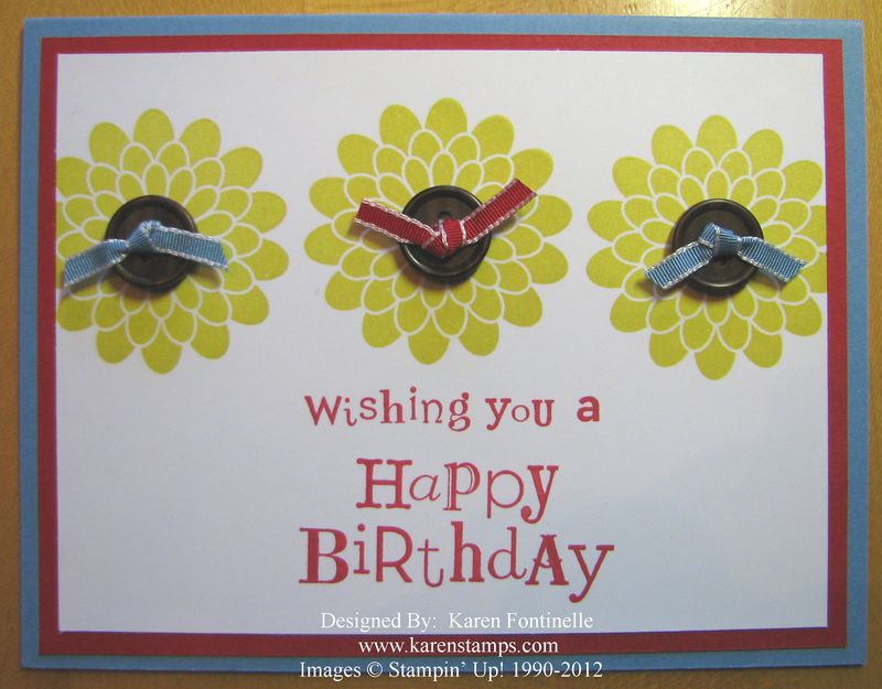 Just playing with the stamp set Button Buddies….and my Color Coach! I started off thinking I would make this stamp look like fall flowers…and then I looked at my Stampin’ Up! Color Coach which gives you color suggestions of combinations. Usually you feel like you wouldn’t have thought of that combination on your own, but lo and behold, the Color Coach usually is right! Once I chose Summer Starfruit, the Color Coach suggested Real Red and Marina Mist….so that’s what I used for my card. After stamping my flowers, I added the new Naturals Designer Buttons in the Stampin’ Up! Catalog, tied with a bit of Real Red and Marina Mist 1/8″ Taffeta Ribbon.