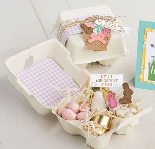 As you can see, the Mini Egg Cartons come very plain, just like real egg cartons. You can spritz them with a color if you like, using the Stampin’ Spritzer and ink refills, or leave them plain and embellish according to the occasion. In the photo at the top of my blog post, you can see there is a piece of designer paper inside the lid and a matching belly band around the carton plus decorations made with the Basket Bunch Photopolymer Bundle. These can be used as a gift box or treat box. If you are looking for a different kind of presentation, this just might be it!