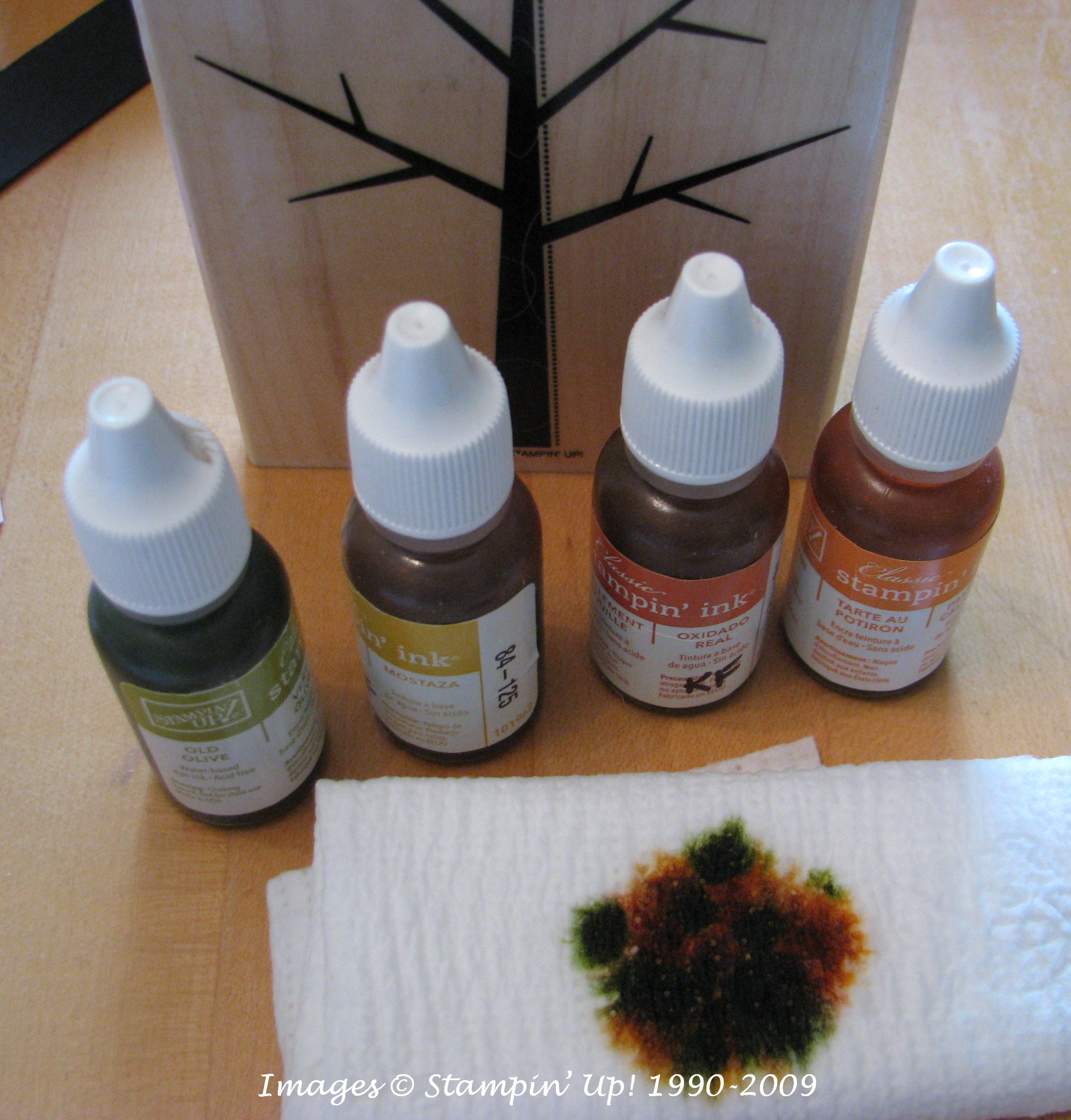 Here's a card I made to commemorate the day, and it literally only took about five minutes! I LOVE this stamp set, "Season of Friendship"! It is so much fun to stamp the leaves on the tree! Stamping is so easy and fun! To make it interesting, I decided to use the baby wipe technique. As you can see in the photo, I just folded up a baby wipe, dropped a few drops of several colors of reinker for fall (Old Olive, More Mustard, Pumpkin Pie and Really Rust) and inked up the leaves on that instead of an ink pad. Worked like charm! It looks like the leaves are just starting to change color!