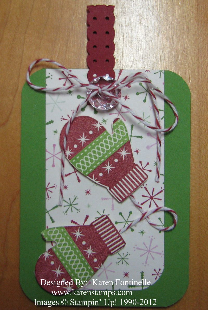 So while I am home enjoying keeping up with Convention coverage, I’ll be playing with some new stamp sets. This one is Chock-Full of Cheer (catalog page 10) and I pretty much copied the sample tag on page 9. The designer paper on the Gumball Green card stock is the new Be of Good Cheer #126896. Notice the new cute button at the top! It’s one of the Vintage Faceted Designer Buttons #127555.