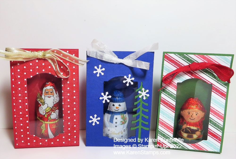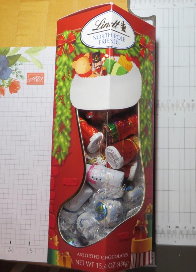 Put the candy inside, and to hold it in place, use a few Glue Dots but be very careful not to get any glue in contact with the chocolate. No one wants to eat a Glue dot! I stuck about two or three on the back of the candy figures, but you could also use one on the bottom of the figure.