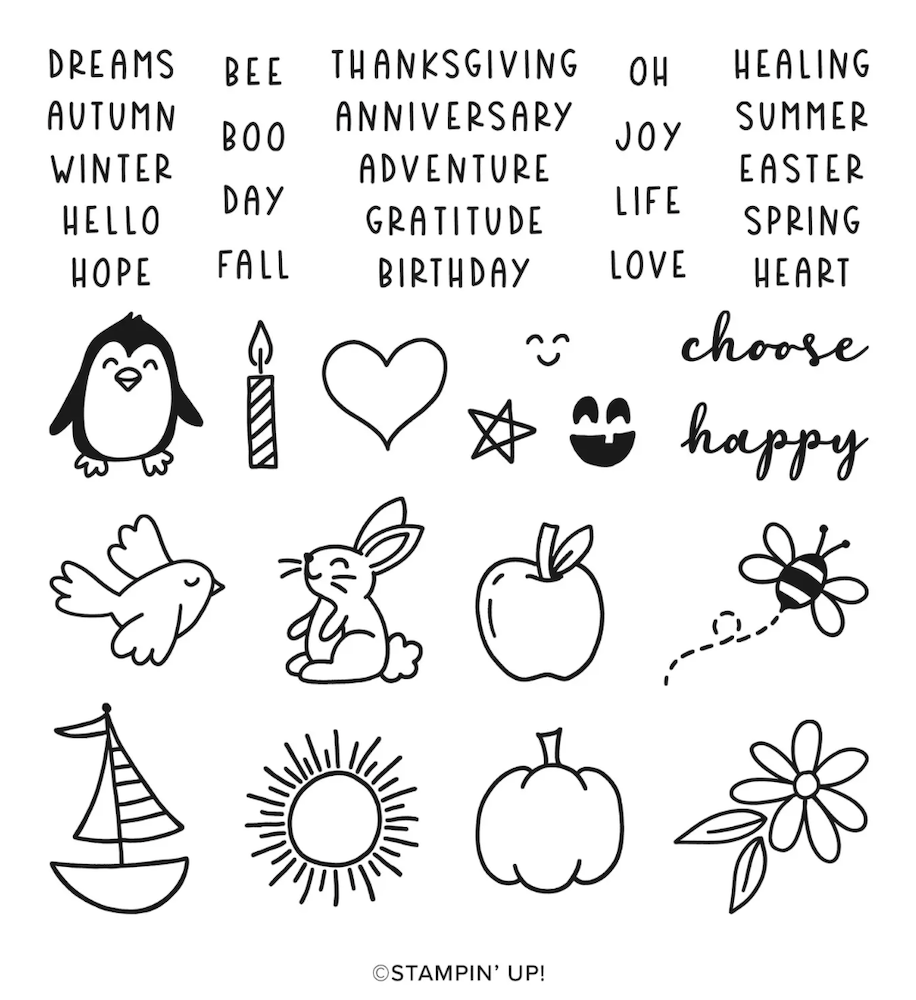 This stamp set is full of simple little images to use in all kinds of ways plus numerous useful sentiments that you can pair up however you like. Stamp the images as I did randomly for a background in one color to make a monochromatic card or color them in.