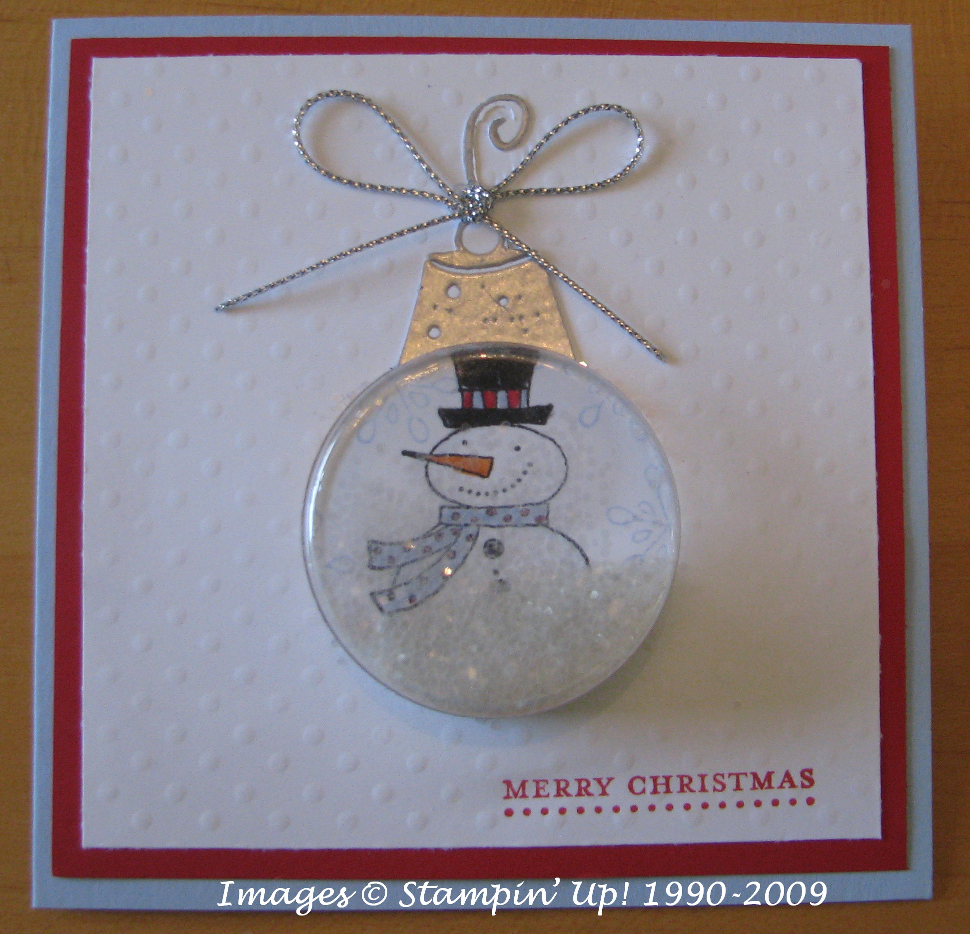 Here's what you can do with a Sweet Treat Cup in the Holiday Mini for Christmas! The card base is 4 1/4" x 4 1/4", layered with Real Red and Whisper White card stock. The Whisper White was run through the Big Shot using the Backgrounds 1 Texturz Plate. I used the ornament top from the Sweet Centers stamp set (embossed with Silver and cut out) and the Silver Elastic Cord in the Holiday Mini. The Sweet Treat Cup has some Chunky White Glitter in it for snow. The snowman is from the new Level 2 Hostess set in the Holiday Mini, Snow Buddies. It is so cute, you will want to earn this set! Yes, the Holiday Mini has two hostess sets to choose from! The small sentiment is from Teeny Tiny Wishes….and in this case, it was great to have a teeny tiny sentiment to fit exactly right on this card!