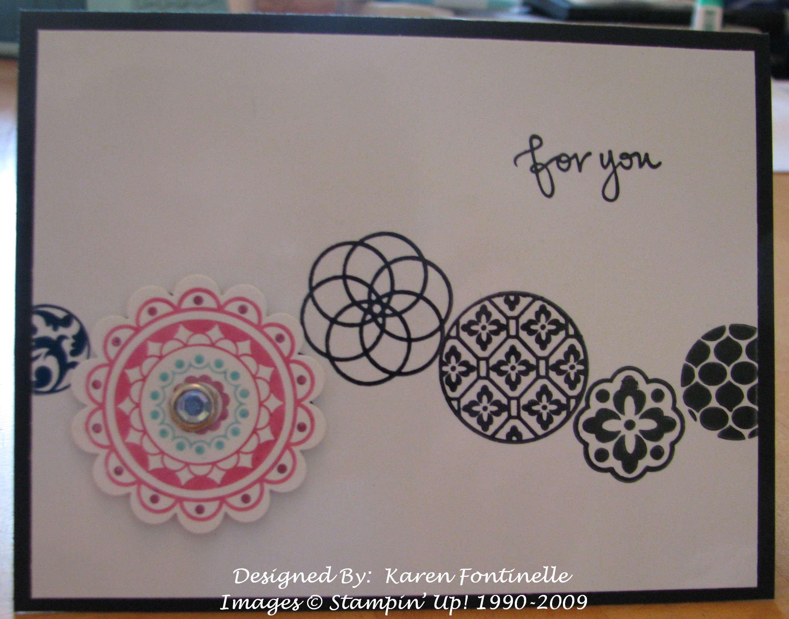 Here is one of my Stampin' Up! Convention swap cards. A long time ago I did a black and white swap where obviously we only used black and white. That has always stuck with me as a very simple and sometimes elegant way to stamp. This card is stamped on Glossy White cardstock with Black Stazon ink. You just have to be a little careful as the glossy paper is slippery! The "medallion" is stamped by coloring on the stamp with various markers. This was too time-consuming for making 40 swap cards copying this design, so for those I used the Baby Wipe Technique as seen in this post. I've been using the Rhinestone Brads a lot also.