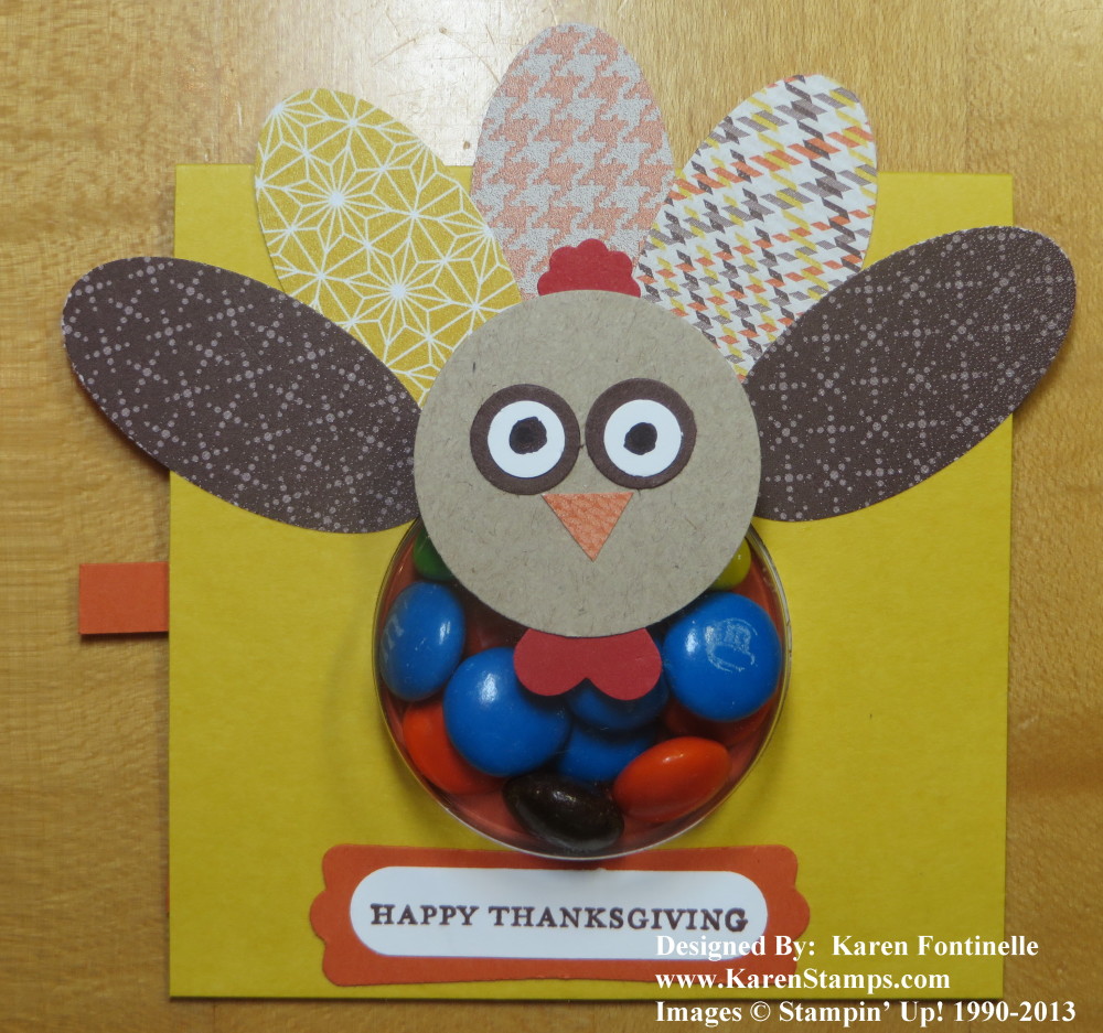 My little turkey favor looks a little spaced out, I think! Maybe I need to do his eyes better! This is a fun favor to make for your Thanksgiving table with the Circle Treat Cups. It’s actually a little card 3 1/2″ x 3 1/2″ that can stand open on the table at each person’s plate. Use a 1 3/4″ Circle Punch to punch a hole for the Circle Treat Cup. I used Mini Glue Dots to attach the front edge of the treat cup to the inside of the card. Rather than just cover up the back of the treat up after the candy was inside, I cut a slightly smaller piece of card stock to fit on the back and punched a hole in that to line up with the treat cup. I only put a thin line of glue on three sides of that card stock so one side would be open. Next I cut another smaller piece of card stock to slide inside to cover the hole. You can see the little tab I cut out so the person can pull that piece out and retrieve the candy easily ( I meant to put it on the opposite side, but it’s fine!).