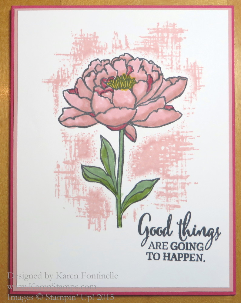 The card base on this sample is Melon Mambo, the layer Blushing Bride. To color in the flower I used Pink PIrouette as the lightest color, Blushing Bride and thought I was using Melon Mambo for a few dark accents but it turned out to be Rose Red! All Stampin’ Write Markers. The flower stem colors are a couple of greens, Wild Wasabi and Old Olive. The background ink color is Blushing Bride.