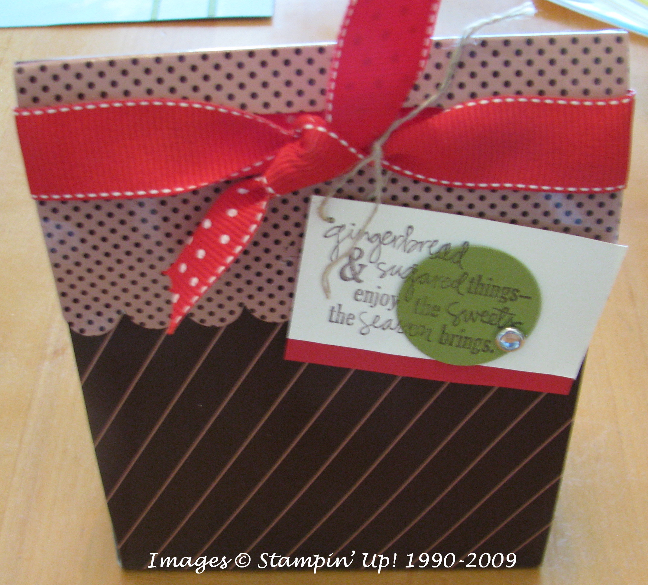 The new Treat Boxes, page 159…more like a bag than a box, but very nice. The ribbon is polka dot on one side and plain on the other.