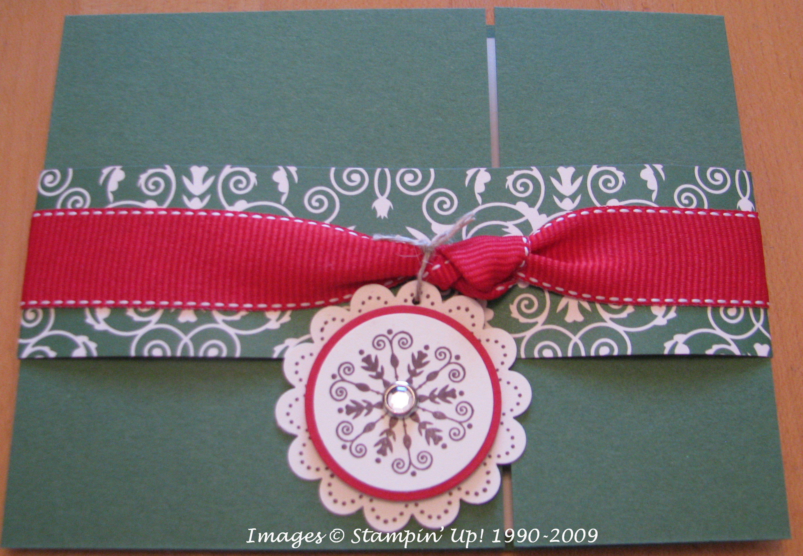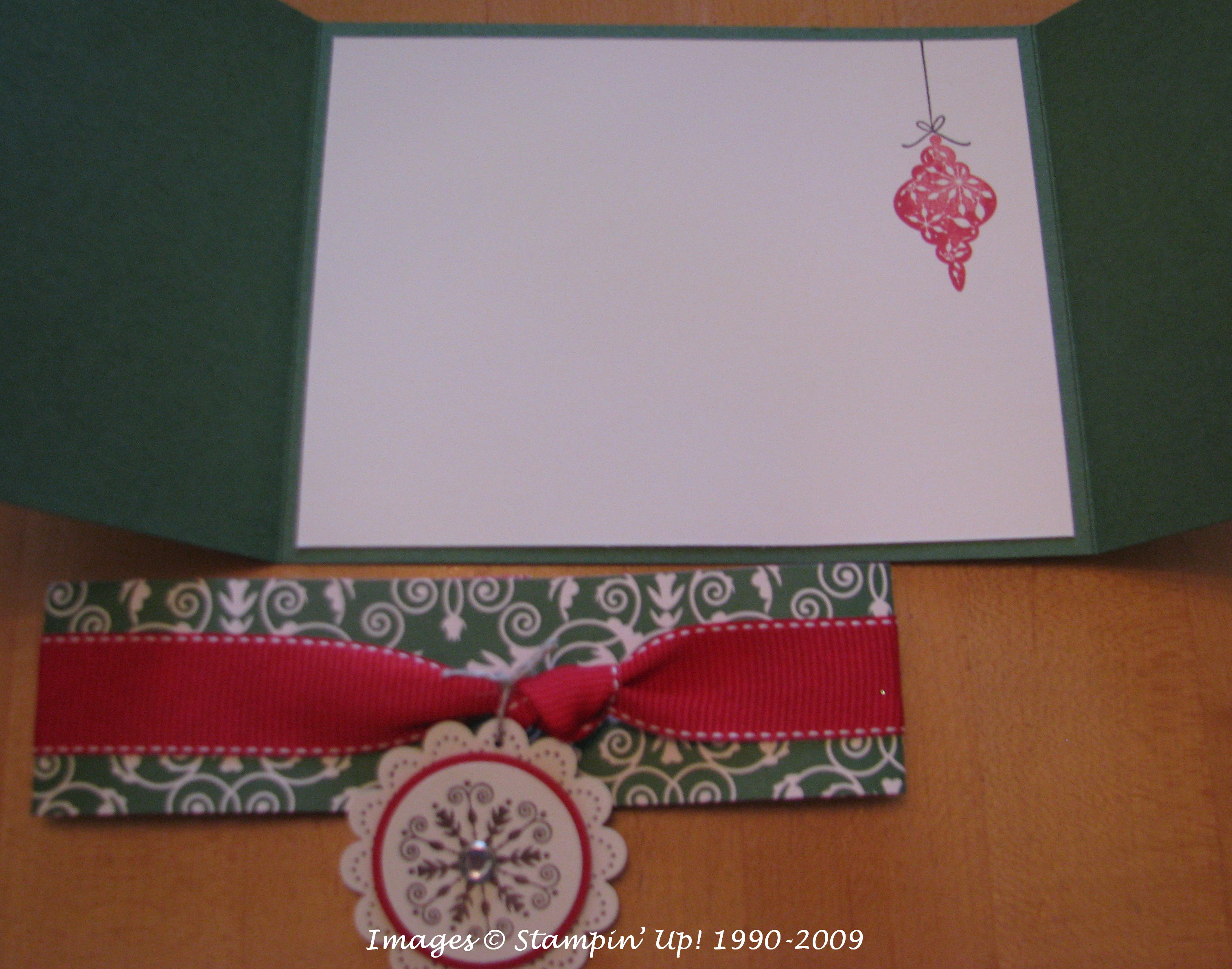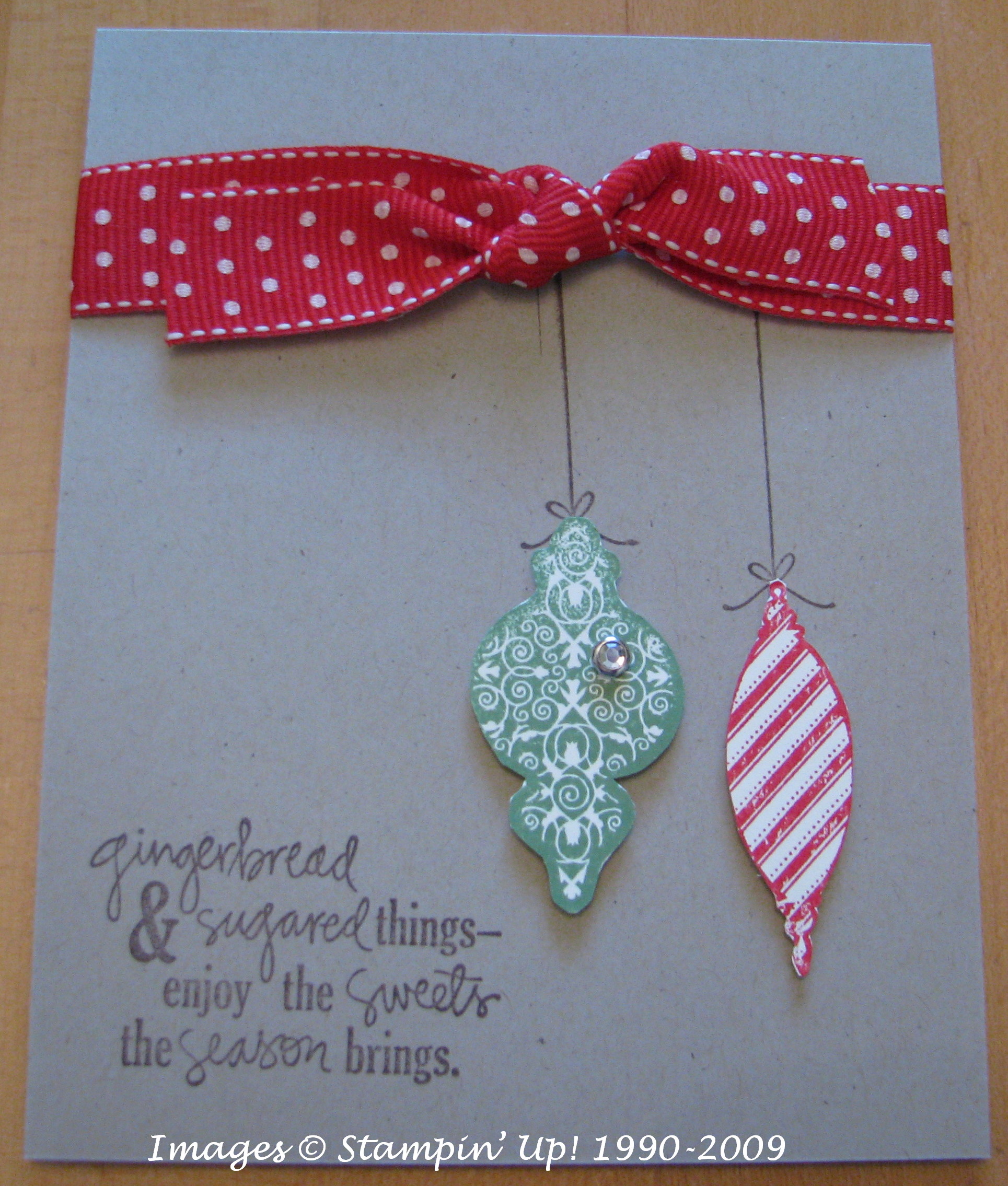Easy Christmas card, although you have to cut out the ornaments by hand! Love the new ribbon!