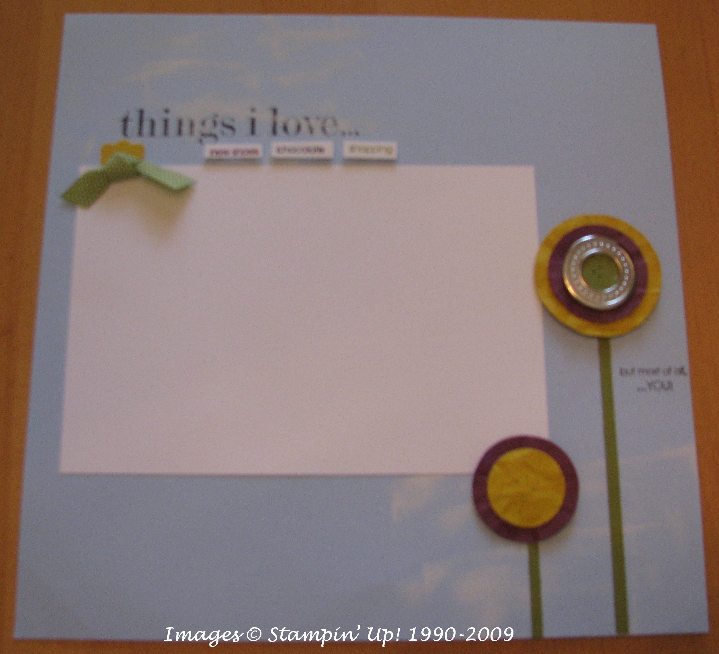 A scrapbook page with some Direct to Paper White Craft ink, a grommet on one of the flowers, and notice a little end of the Modern Label punch sticking up above the bow at the top where the photo would go. (sorry, the photo is a little blurry!)