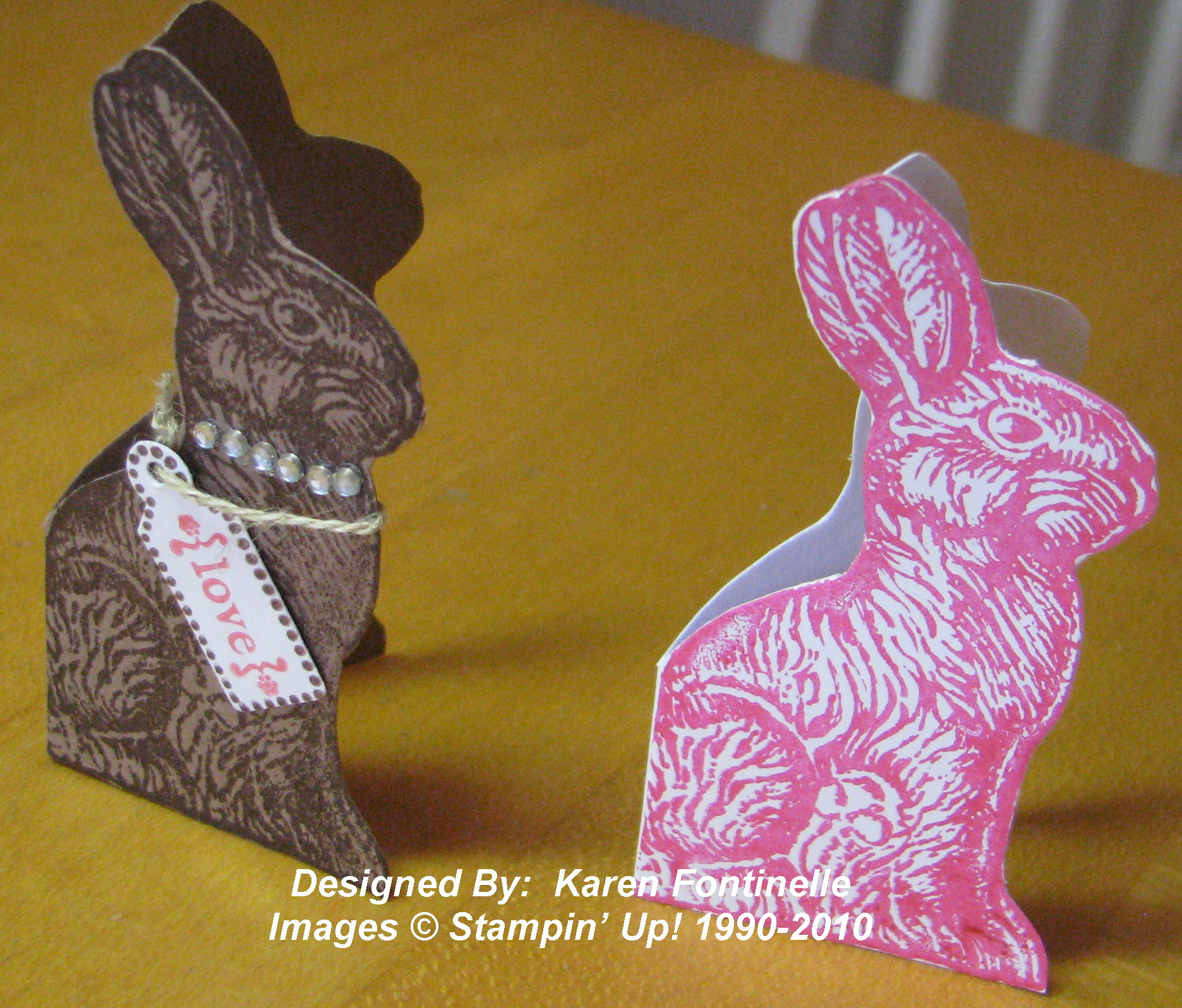 Today I was looking online and saw where someone had made templates of Easter bunny shapes, and you could use that template to draw and cut out bunnies that would stand up as a card. However, Stampin' Up! already has a really cute stamp in the Occasions Mini, sold as a single stamp, called "Chocolate Bunny" (#116980)! It's been very popular and fun to make things with. So I decided I could do nearly the same thing by just stamping the bunny on a piece of card stock, putting his "rear" on the fold, and cutting out the shape!