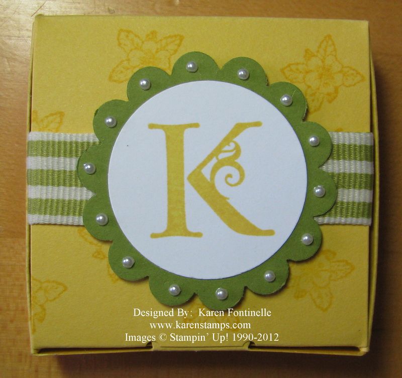I stamped some images on the box, a little flower from the retiring stamp set Clearly for You (available in wood- or clear-mount). For the little monogram on top I used the beautiful Lovely Letters Alphabet #115030 and the Scallop Circle Punch #119854. For some bling, I added the tiniest pearls to the scallops. The ribbon wrapped around the inside of the lid is actually the 1 1/4" Striped Grosgrain Ribbon in Wild Wasabi #125059 (also retiring).