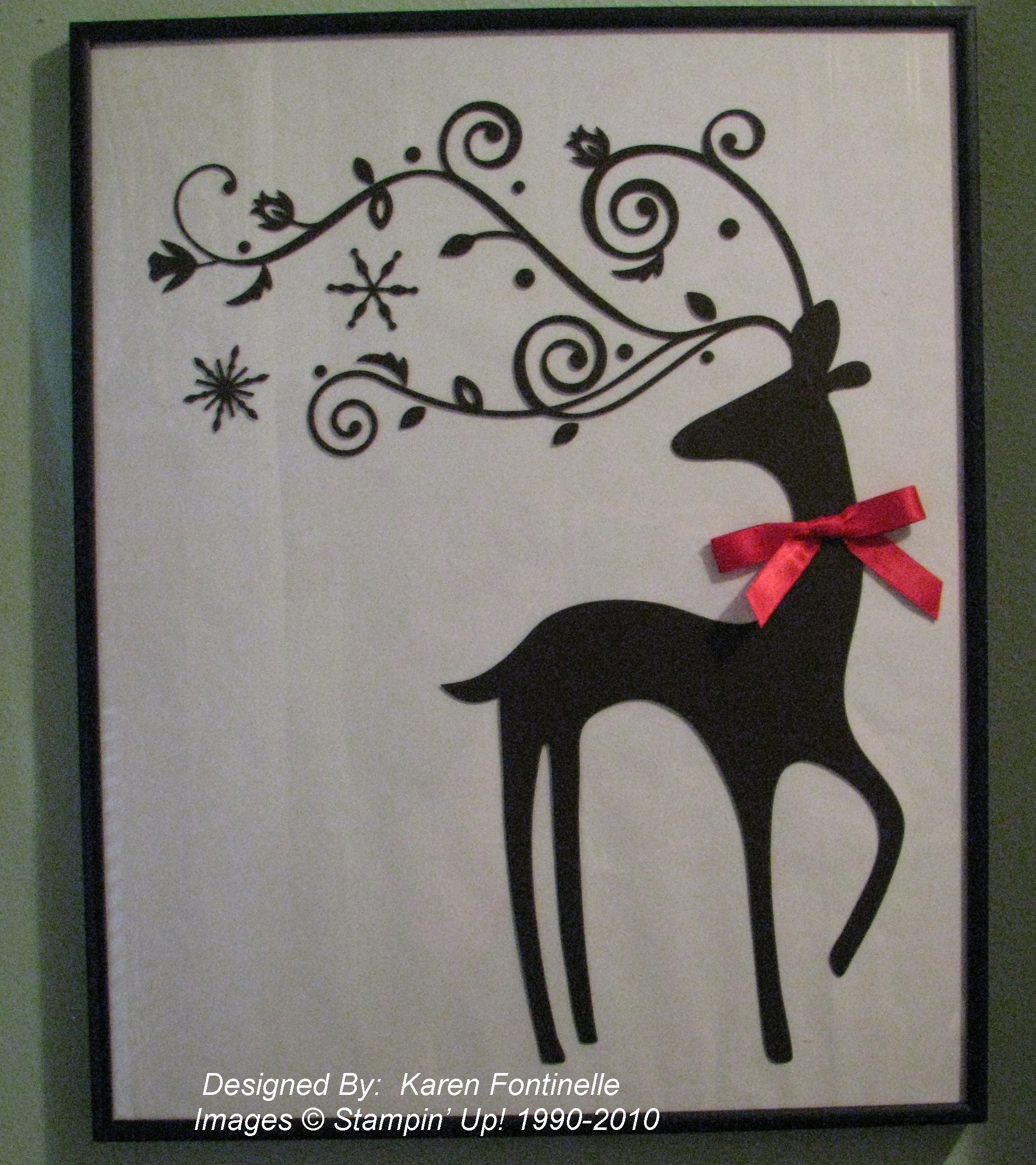 This Dasher is one of Stampin' Up!'s Decor Elements vinyl art from last year. In fact, he was a Hostess gift. Did you know you may choose a Decor Element for Levels 2 and 3 as your Hostess gift instead of a stamp set? Just check out the Definitely Decorative Catalog HERE! I never got around to putting him up, but today I took a few minutes to put him on the glass of this 16" x 20" frame. I covered the cardboard within the frame with white wrapping paper since it is wider than our 12×12 paper. And for a little extra, I added a red satin bow! This way I can put him up and take him down for many Christmases to come rather than putting him directly on the wall.
