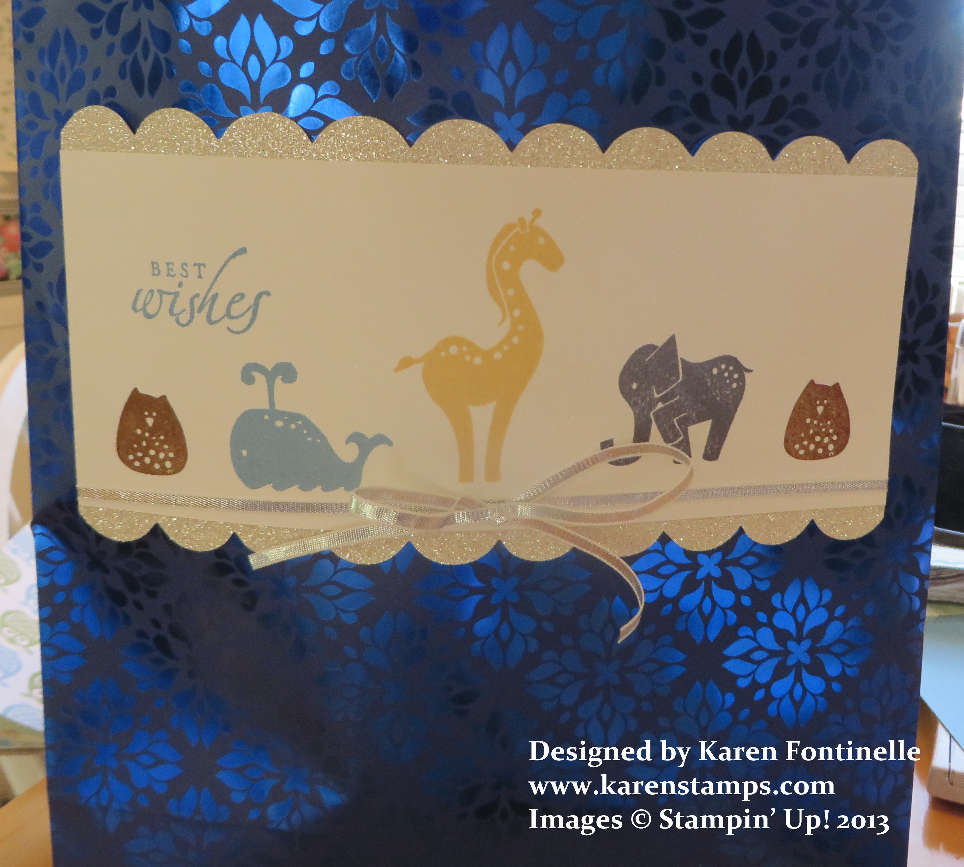 While I had this shiny blue gift bag, it needed something to be appropriate for a baby gift. I just stamped a panel to put on the front of the bag. The animals are from the retired stamp set “Animal Stories” (do you have it in your stash?). Even the greeting is retired but from one of my all-time favorite, how-can-we-live-without-it stamp sets, “Sincere Salutations”. Of course the panel still needed some jazzing up. I used some pieces of the Silver Glimmer Paper die cut with the Tasteful Trim Bigz Die for the top and bottom edges and tied some Silver 1/8″ Ribbon in the Holiday Catalog around the panel.