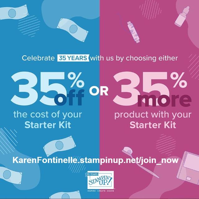 The new special for October is an excellent deal for the Starter Kit if you want to become a Stampin’ Up! Demonstrator and start your own business! To celebrate Stampin’ Up!’s 35th year, you have two choices: get 35% off the cost of the Starter Kit or add another 35% more in product to your kit! It’s always a good time to purchase the Starter Kit and officially become a Demonstrator, but when there is a special deal, it’s really a great time! More details below.