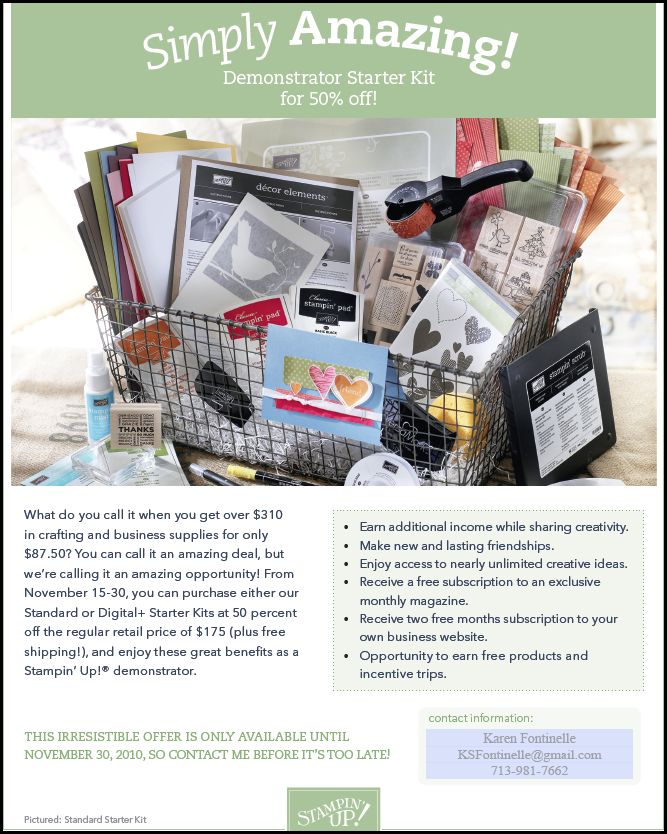 It's always a good time to sign up to be a Stampin' Up! Demonstrator, but right now, during Sale-A-Bration is an especially good time! The Starter Kit, which is normally $175 is discounted 15% during Sale-A-Bration which means you can start your own business in minutes and become a Stampin' Up! Demonstrator for only $148.75 until March 31, 2011.