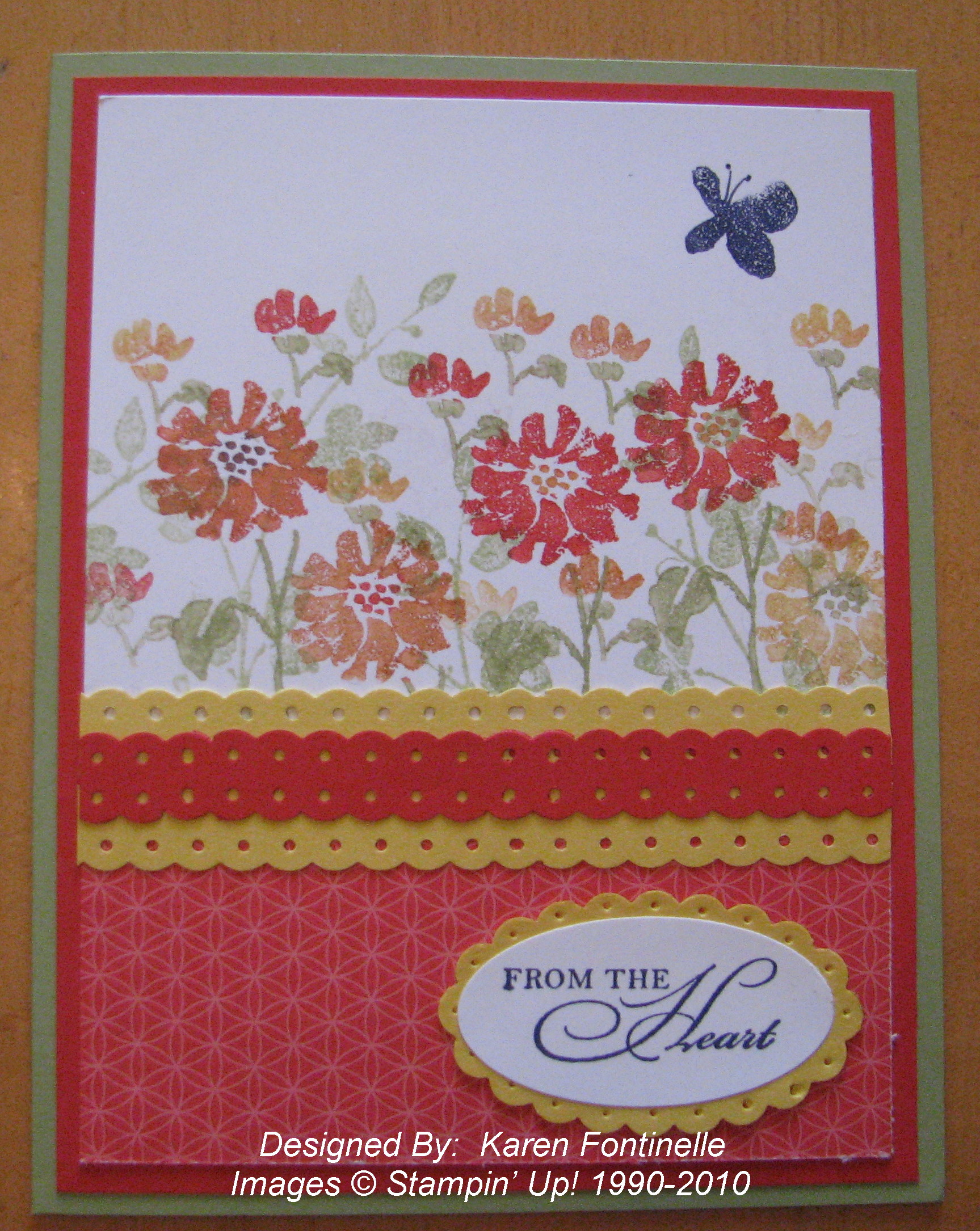 In my box of new goodies from Stampin' Up! last night was this new Designer Series Paper, Sunny Garden #119831 and the new Dotted Scallop Ribbon Border Punch #119275. I wasn't quite sure how I would use that punch, but after playing around today, this is what I came up with and decided to do the three strips layered. I really like it! The flowers are stamped with Watercolor Trio (Summer Mini p. 16), colored with the Stampin' Write Markers. The colors I used were Pear Pizzazz, Daffodil Delight, Peach Parfait, Poppy Parade, and Concord Crush.