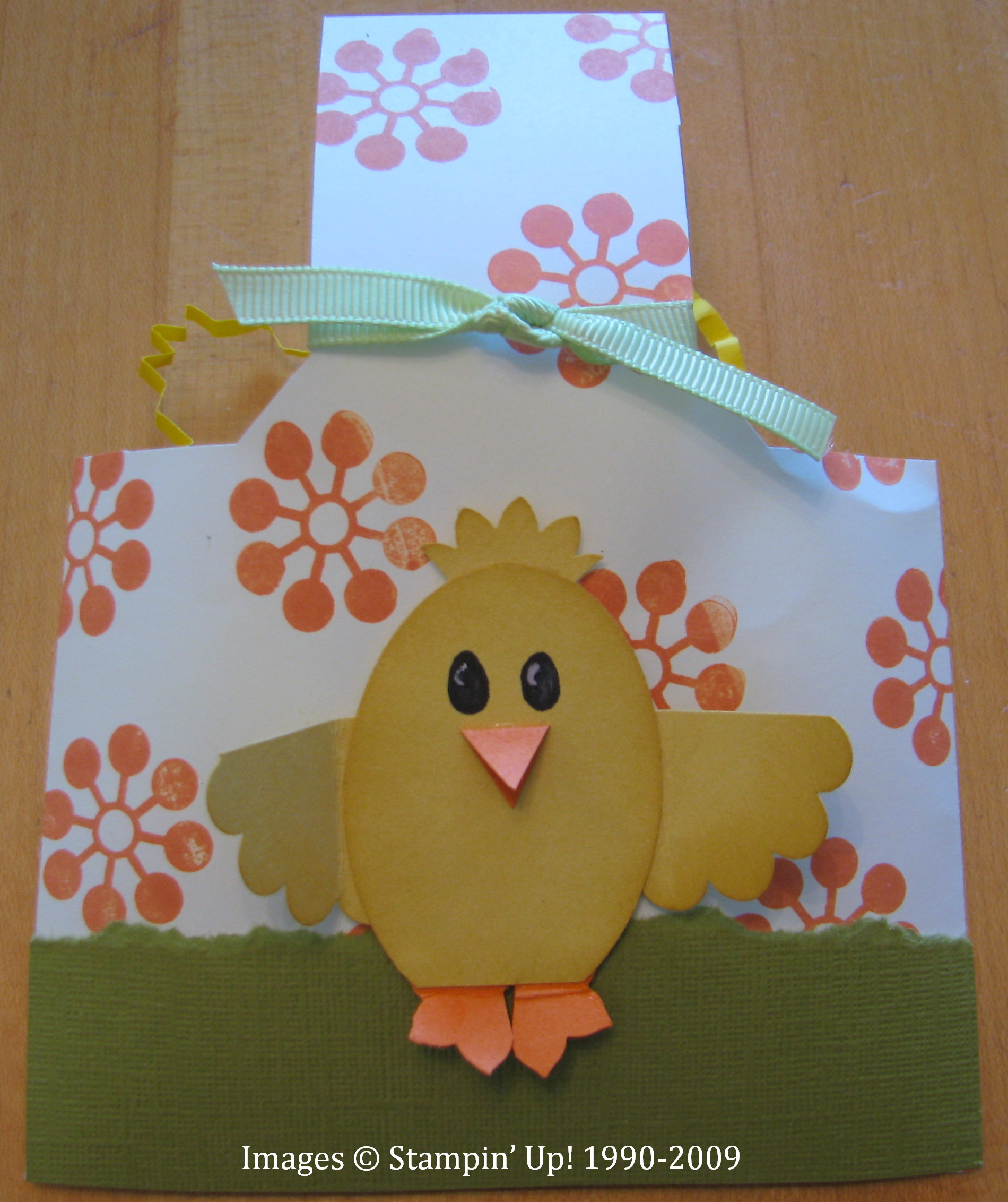Had to make another "envelope basket" like in this post, but I was ready for something different than bunnies, as cute as they are! I got this chick idea from Mercedes Weber on Splitcoast….not sure I made it exactly like hers but it served the purpose. I stamped the envelope with one of the "Wow Flowers" and added a little grass at the bottom with a piece of textured Kiwi Kiss paper. The chick is punched from the large oval punch for the body, the Scallop Circle punch cut for the wings, and flowers from the Boho Blossoms punch for pieces of the feet and top of head. I just drew in his eyes with a black marker (always add a little white twinkle of sorts with a gel pen for eyes to make them come alive!) and cut a little orange triangle for his beak.